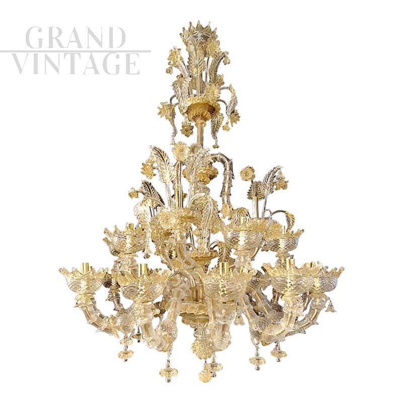Grande e lussuoso lampadario in stile Rezzonico in vetro di Murano dorato ricco di foglia d'oro, alta artigianalità italiana, composto da 12 + 8 + 8 luci per un totale di 28 punti luce.