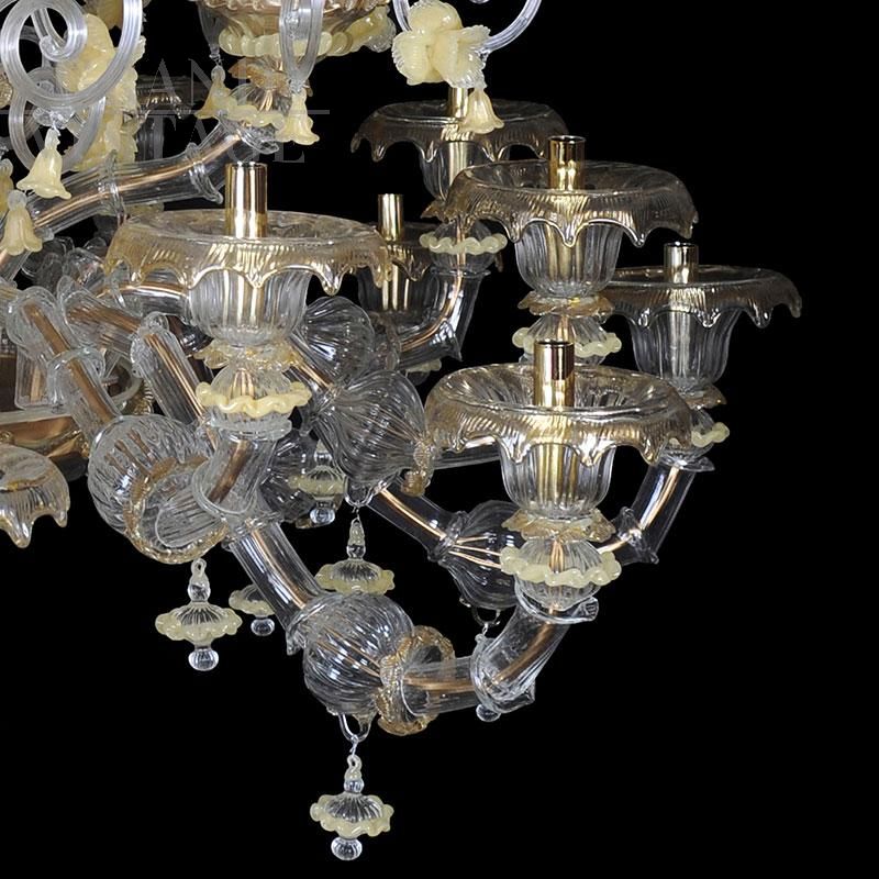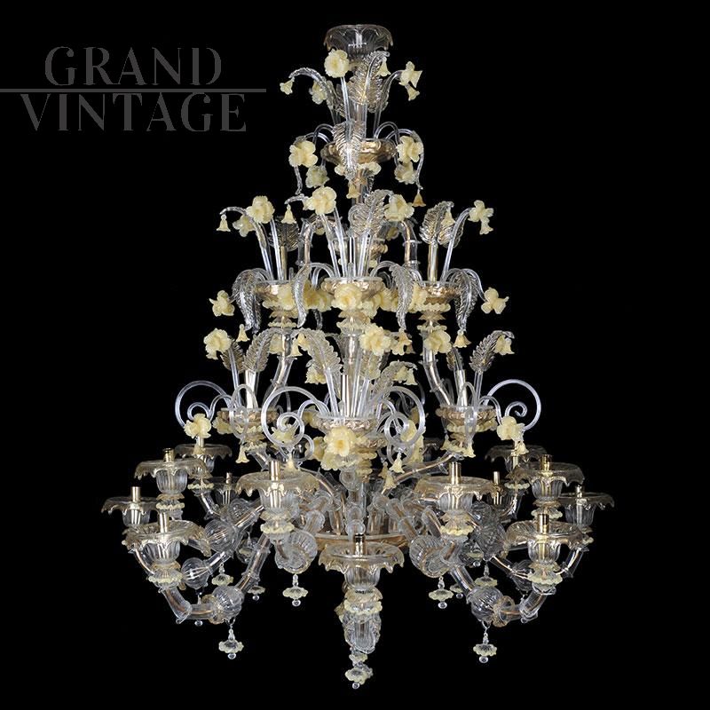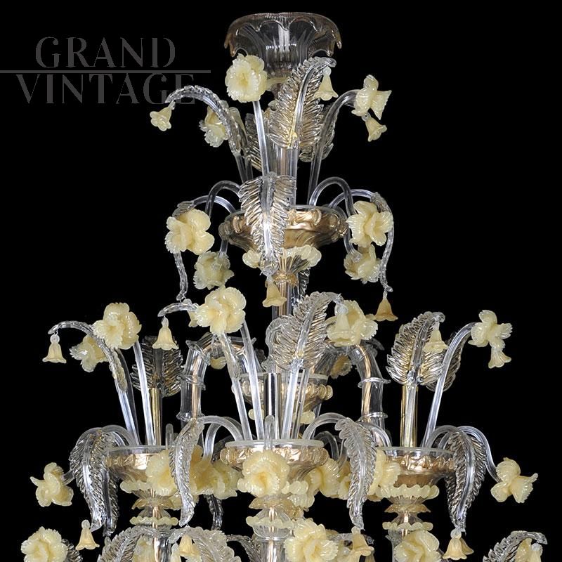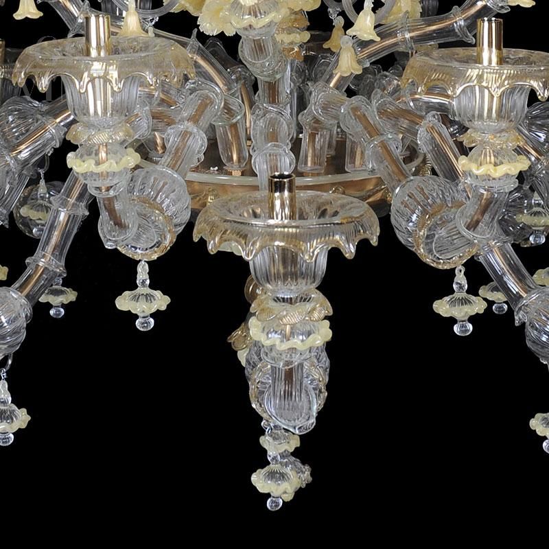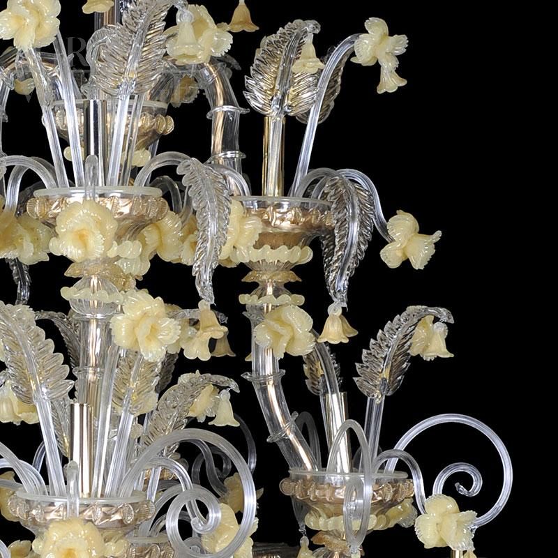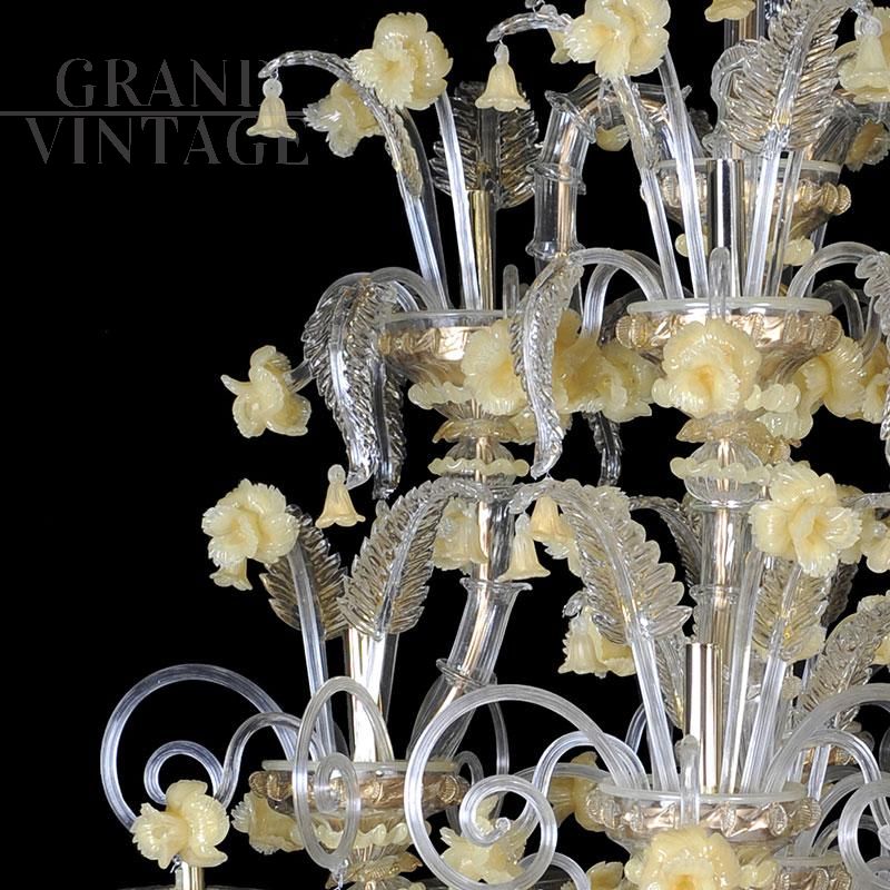 Lampadario in vetro di Murano bianco e oro, stile Rezzonico, soffiato e lavorato a mano da maestri vetrai con tecnica antica. Su ogni braccio in metallo dorato sono infilati, pezzo per pezzo, i vetri detti “bossole” realizzati a “rigadin” (striature longitudinali o spiroidali) che compongono il lampadario. Questo modello, interamente realizzato a mano dai maestri muranesi, è caratterizzato da pregiate decorazioni in cristallo e oro (foglie, coppe e riccioli) ed è impreziosito da numerosi fiori di vetro in pasta colore giallo. Presenta un sistema composto di 24 luci organizzate su più ordini, con attacchi per lampadine di tipo E14 compatibili con lampadine led.