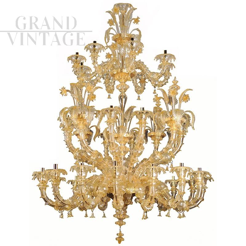 Lampadario in vetro di Murano, stile Rezzonico, della prima metà del XX secolo (anni '30-'40), soffiato e lavorato a mano con tecnica antica, realizzato interamente in oro con foglia 24 carati. Su ogni braccio sono infilati, pezzo per pezzo, i vetri detti “bossole” realizzati a “rigadin” (striature longitudinali o spiroidali) che compongono il lampadario. Completamente restaurato e ricablato, presenta un sistema composto di 32 luci organizzate su tre ordini (16 inferiori, 8 centrali e 8 superiori) idonee a contenere lampadine con attacco E14 (non incluse).
