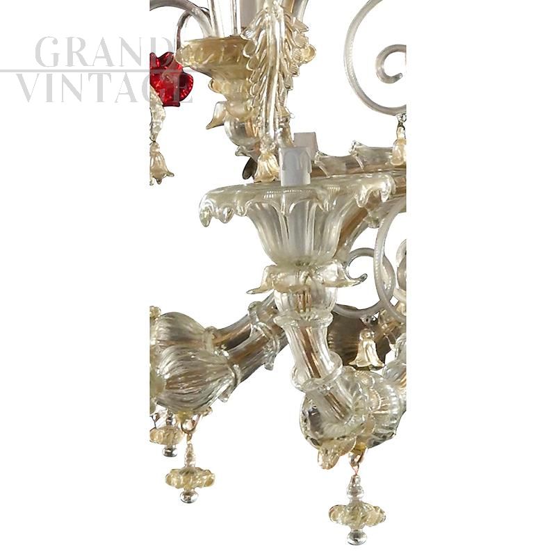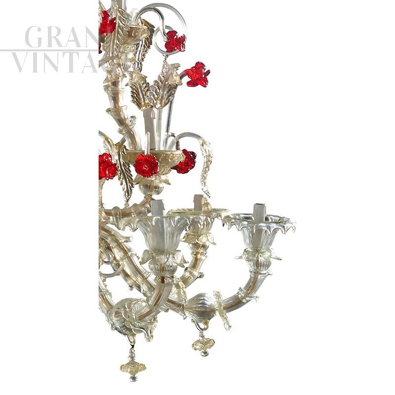 Lampadario Rezzonico in vetro di Murano oro con fiori rossi
