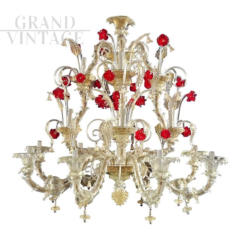 Grande e sontuoso lampadario in vetro di Murano artistico nello stile di Rezzonico con elementi in vetro di Murano trasparente e dorato con magnifici fiori rossi, soffiato e lavorato a mano con tecnica antica. Su ogni braccio in metallo dorato sono infilati, pezzo per pezzo, i vetri detti “bossole” realizzati a “rigadin” (striature longitudinali o spiroidali) che compongono il lampadario. Questo modello interamente realizzato a mano dai maestri muranesi è caratterizzato da pregiate decorazioni in cristallo oro e impreziosito con raffinati dettagli di foglie, fiori rossi, coppe e riccioli. Presenta un sistema composto di 16 luci con attacchi per lampadine di tipo E14 organizzate su tre ordini.