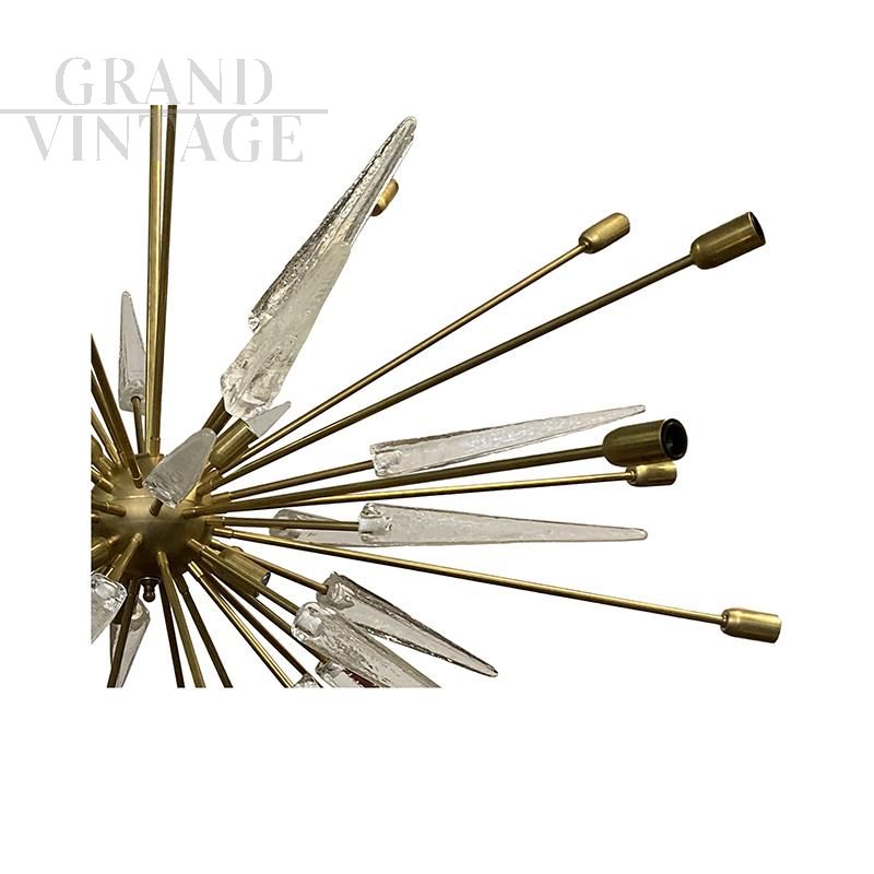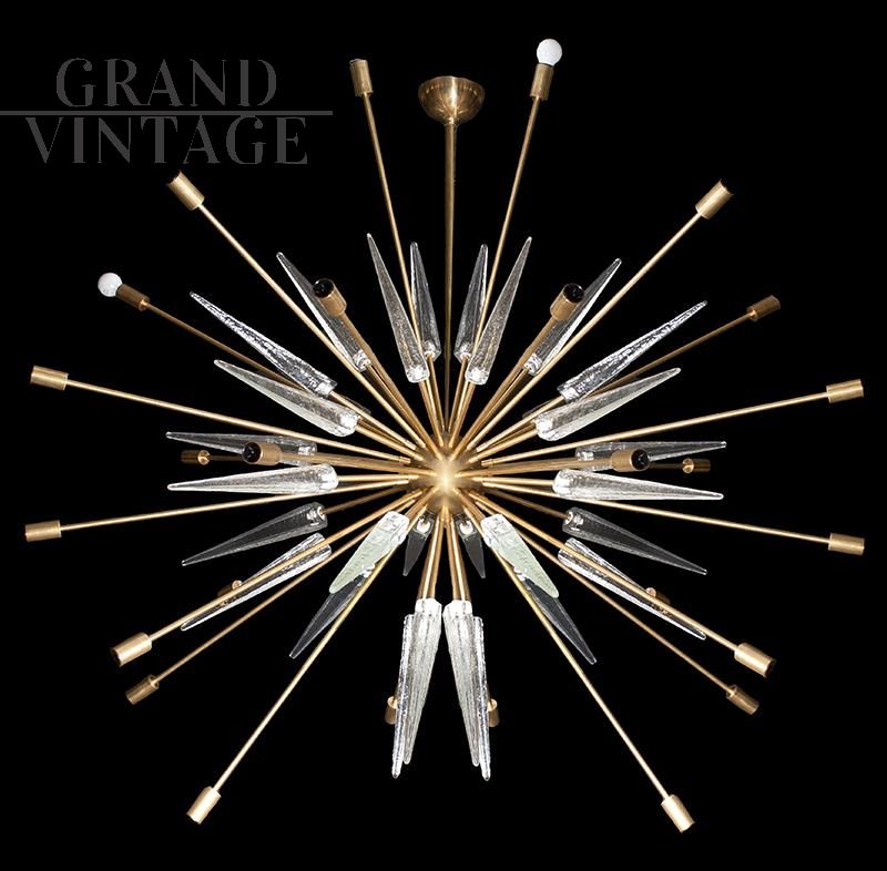 Lampadario moderno Sputnik con asta di ottone con un'estremità superiore semisferica che funge da supporto per una sfera alla quale sono attaccate numerose aste radiali disposte simmetricamente. Questi sono progettati in diverse lunghezze e servono in parte come punto di partenza per un perno in vetro trasparente bordato, in parte come asta filettata.