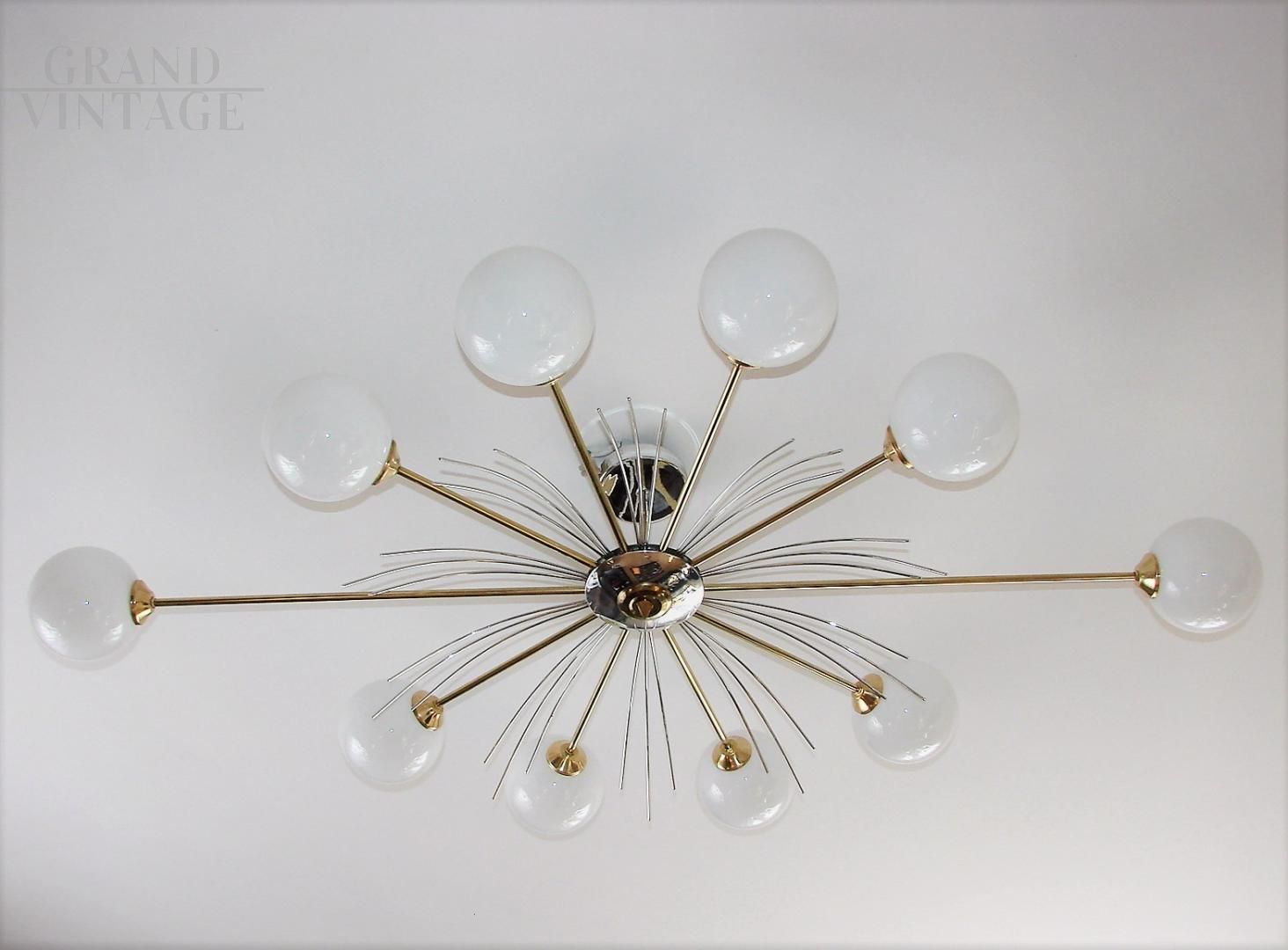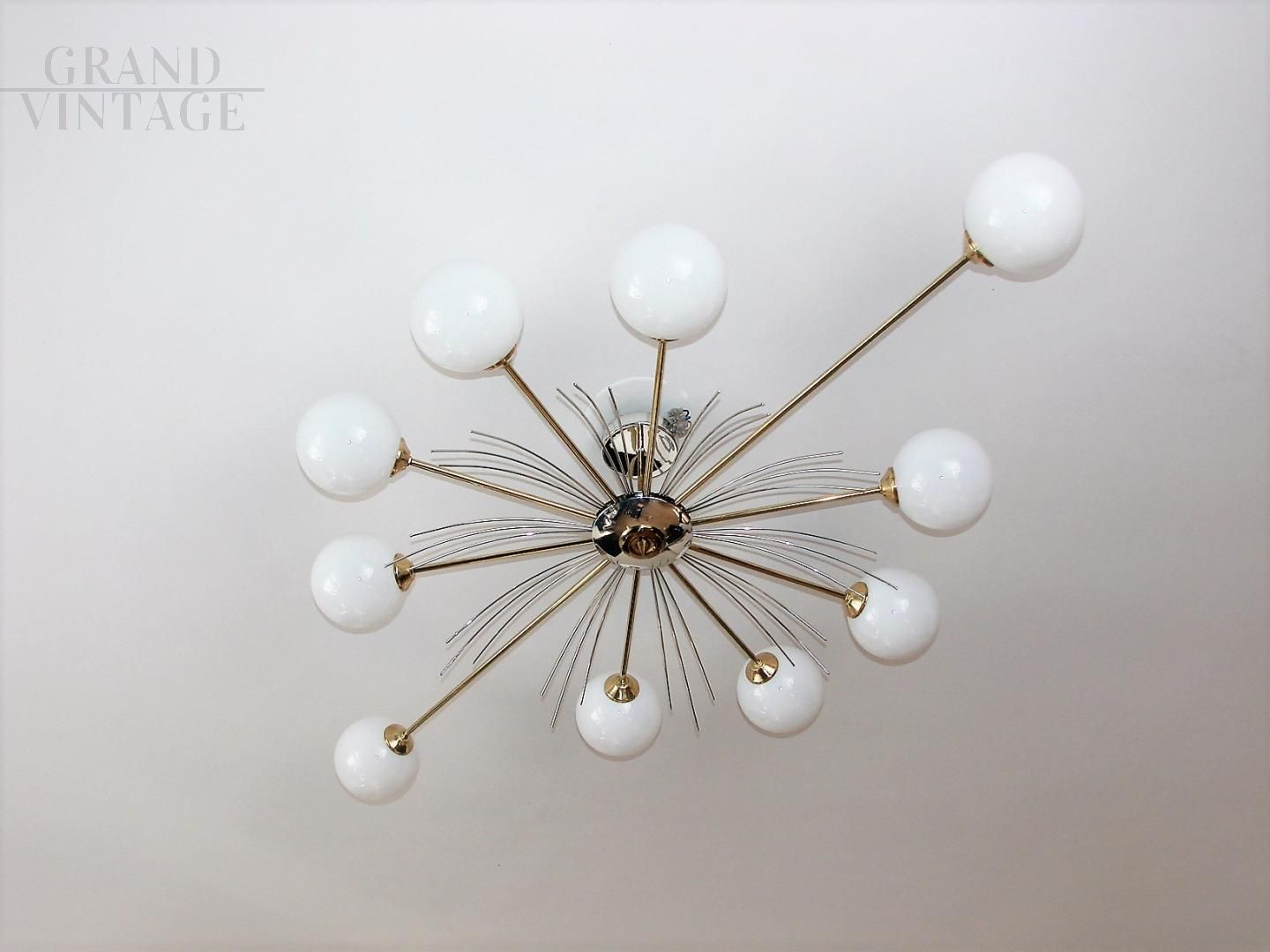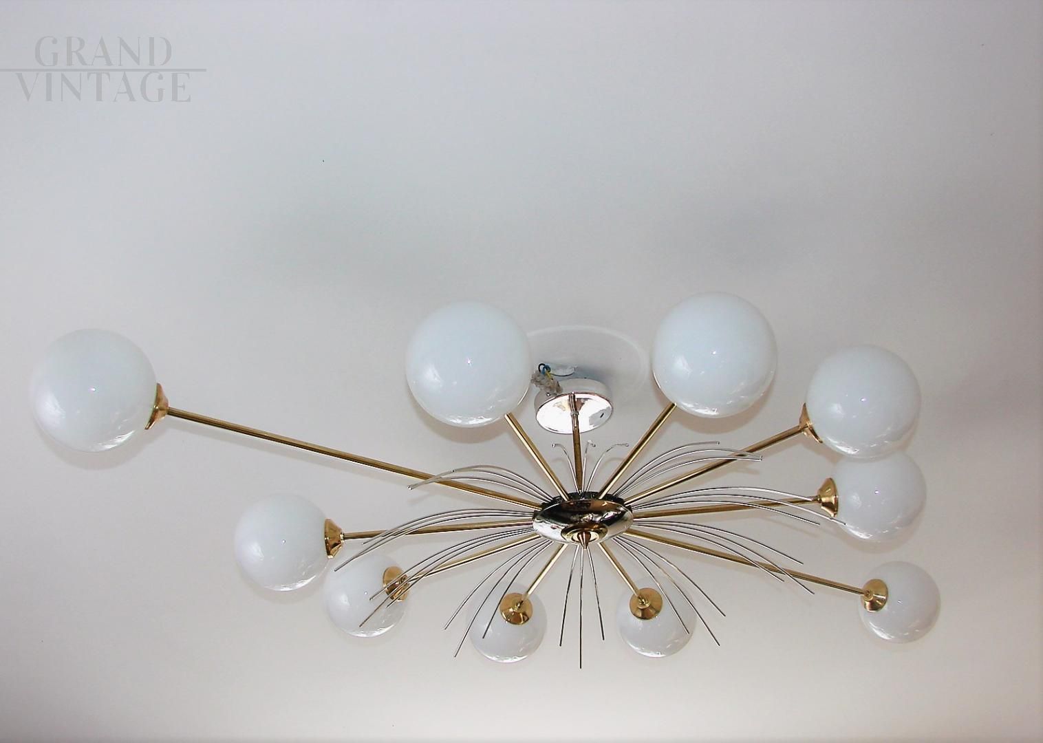Lampadario in stile Stilnovo anni '70 con struttura a raggiera in ottone e metallo e con sfere in vetro bianco. Il lampadario necessita di 10 lampadine E14.
