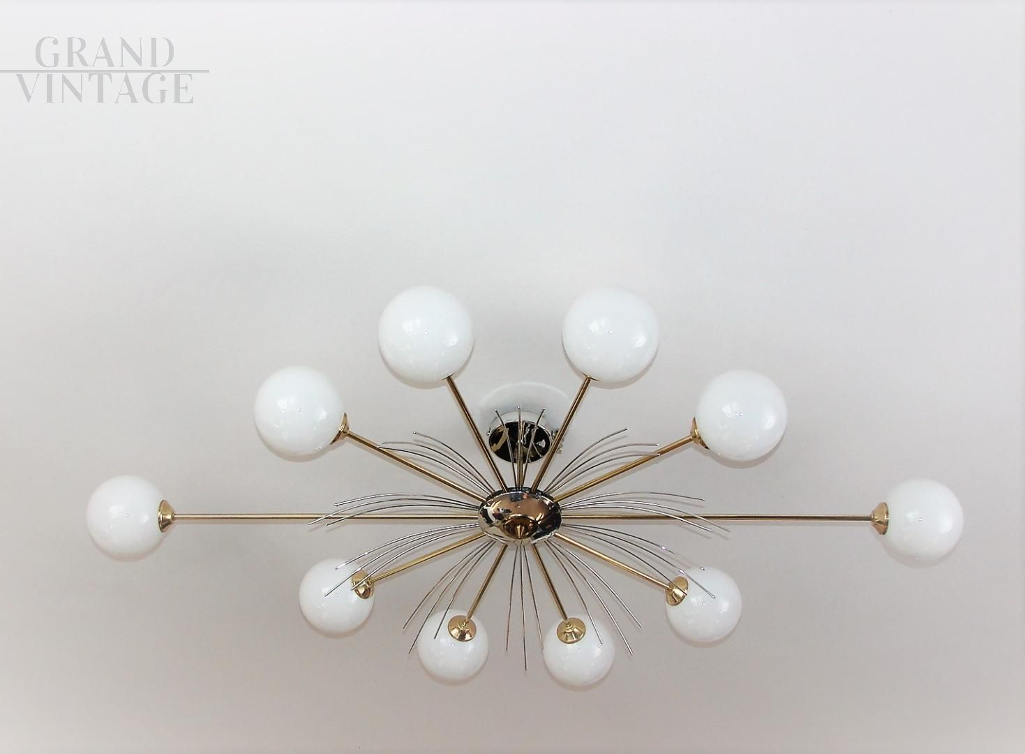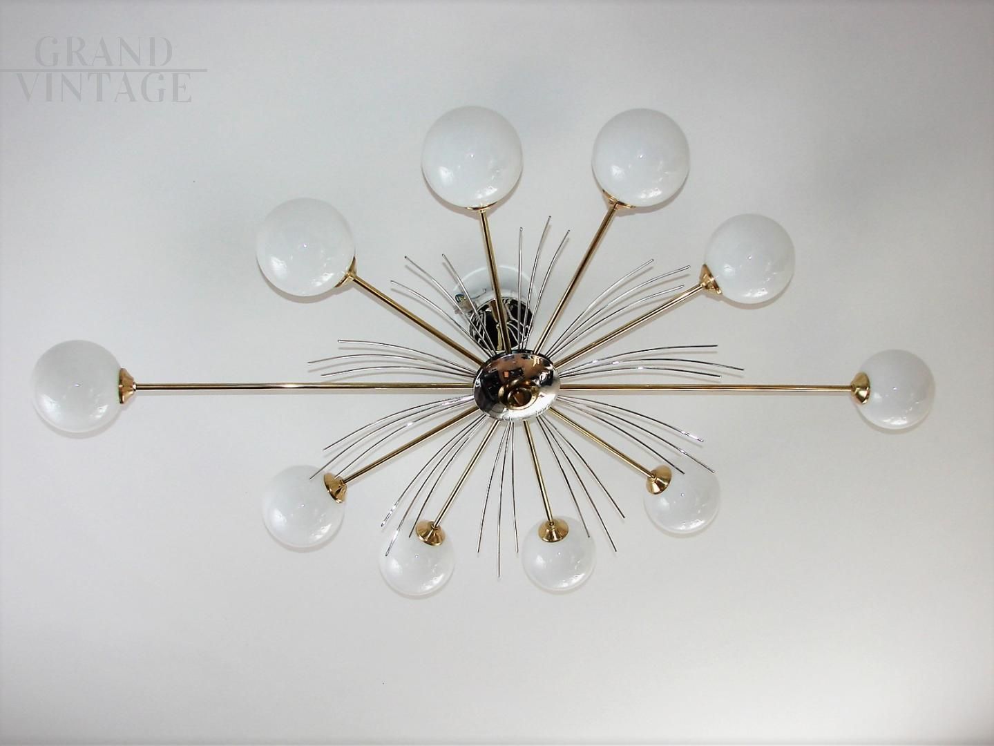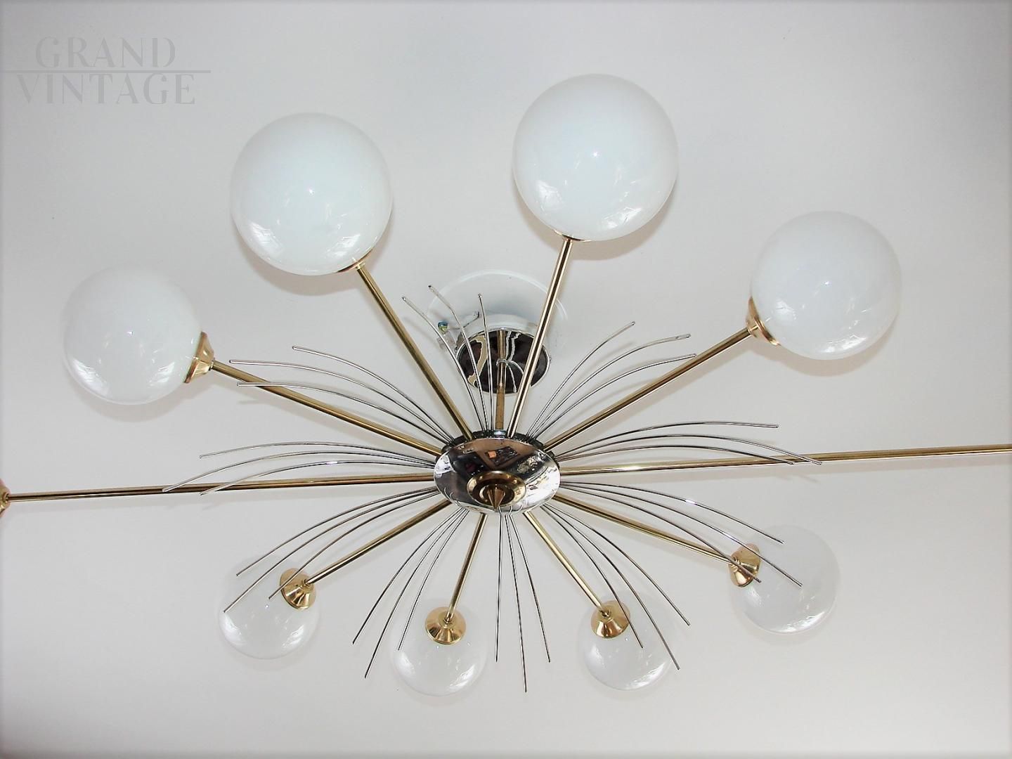Lampadario in stile Stilnovo anni '70 con struttura a raggiera in ottone e metallo e con sfere in vetro bianco. Il lampadario necessita di 10 lampadine E14.