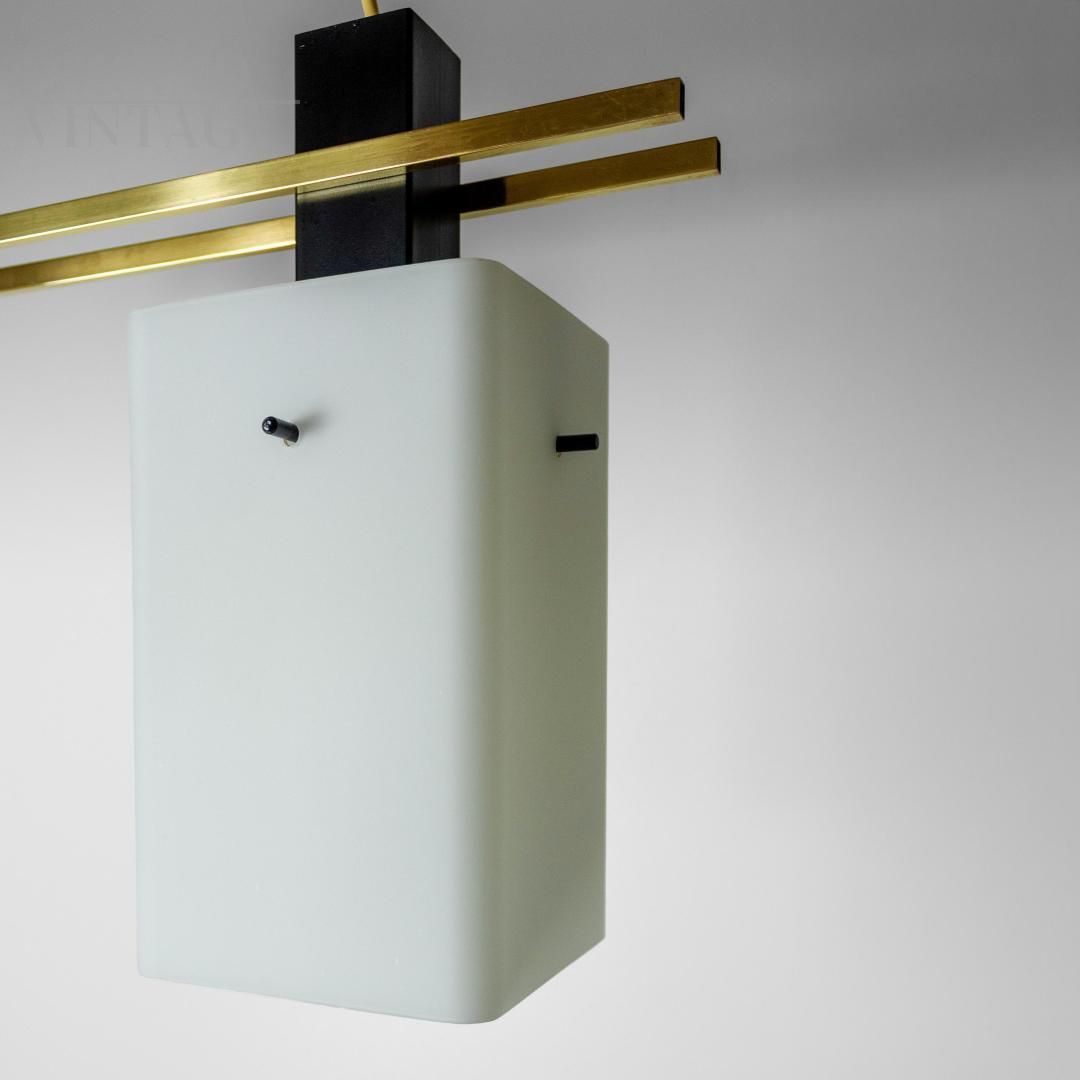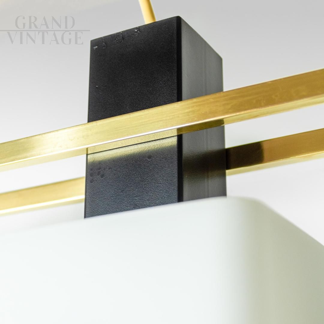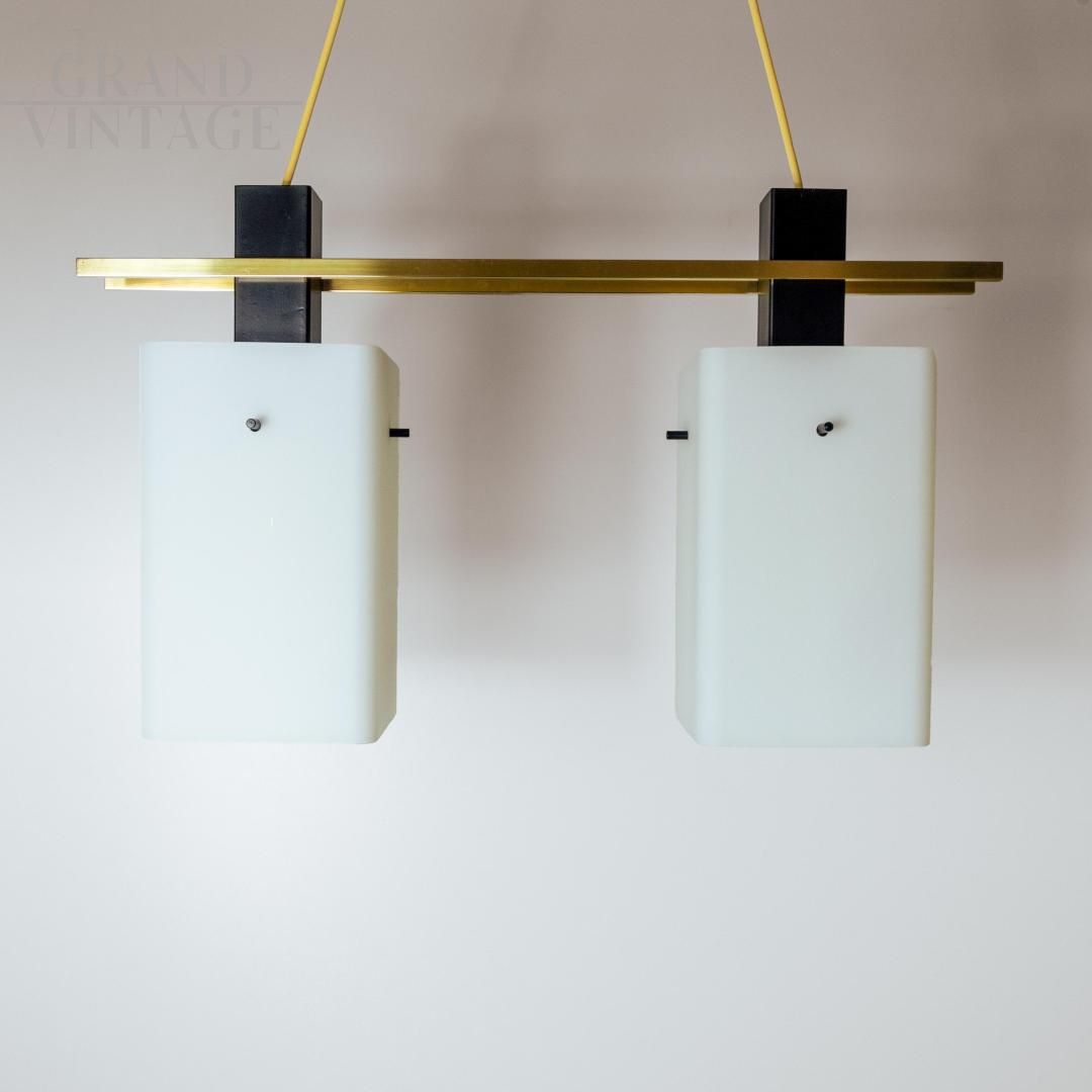 Elegante lampadario a sospensione originale Stilnovo, realizzato in Italia negli anni ’60. Un autentico esempio di design modernista italiano, caratterizzato da due diffusori cubici in vetro opalino, montati su una struttura in ottone lucidato e metallo smaltato nero. Completamente restaurato e ricablato a norma, il pezzo conserva i vetri opalini originali in perfette condizioni. Le parti in ottone sono state lucidate con cura per esaltarne la patina naturale, mentre la struttura in metallo smaltato nero è stata rifinita professionalmente per un effetto sofisticato e senza tempo. Il lampadario è perfettamente funzionante e pronto per l’installazione. Utilizza due lampadine con attacco medio (E26/E27). Altezza complessiva regolabile, adatta a diverse altezze di soffitto