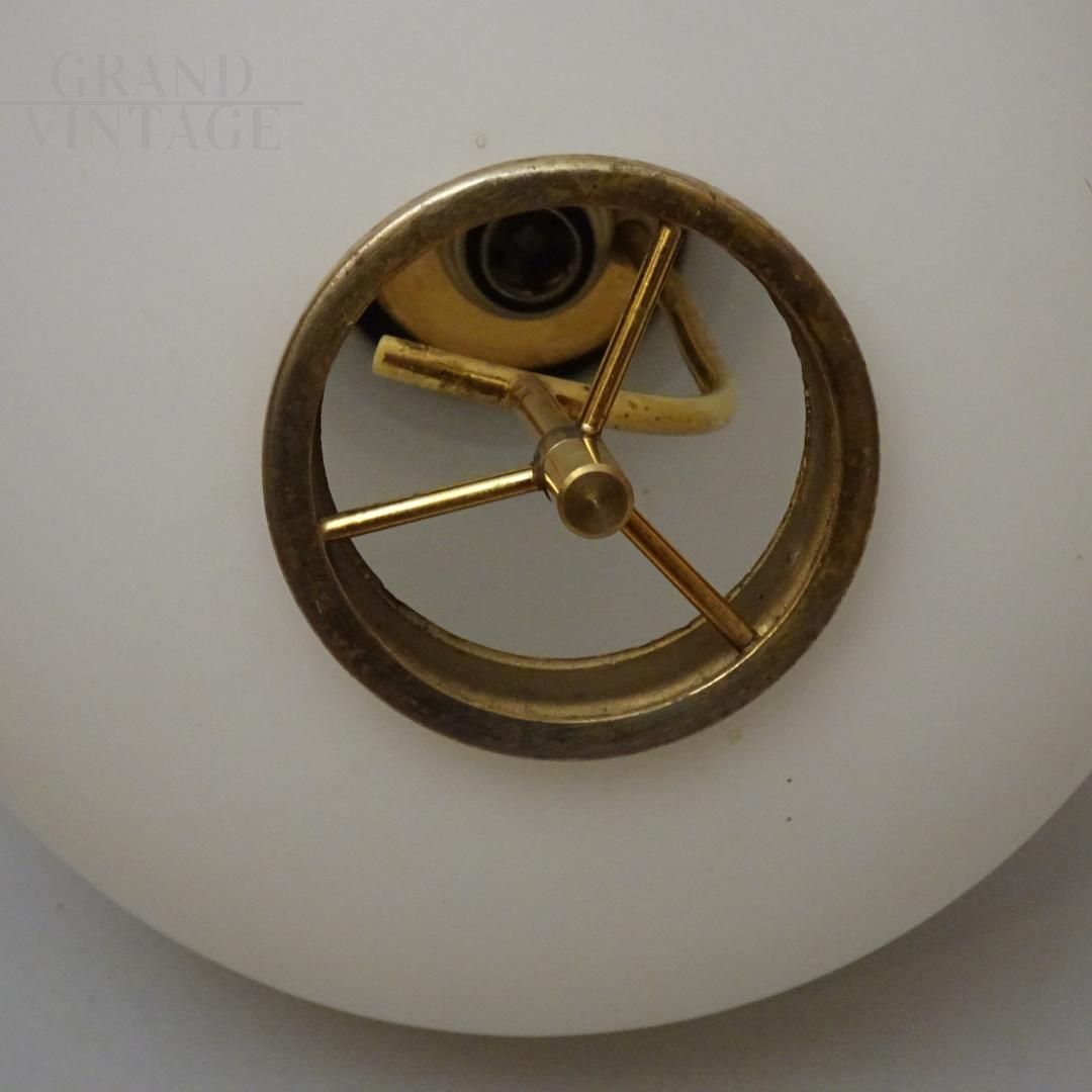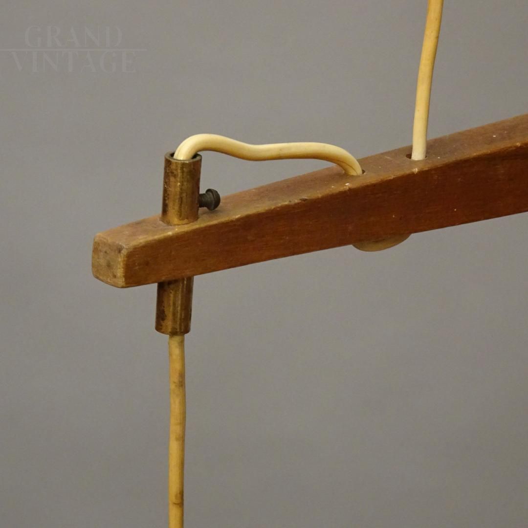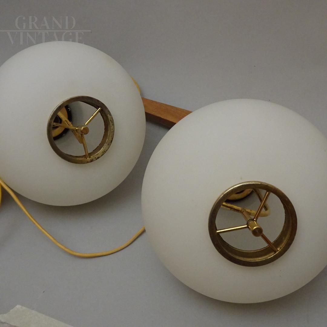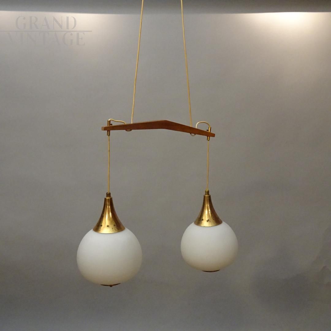 Lampadario Stilnovo anni '50 a due luci con diffusori in vetro opalino satinato e con struttura in legno e ottone decorato da stelle intagliate, con filo elettrico originale dell'epoca, tutto completamente originale. In perfette condizioni, pronto da montare!