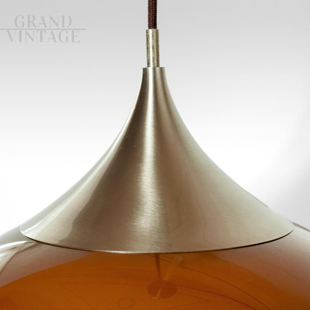 Lampada a sospensione Stilnovo, modello 1238. Esempio incontaminato del modernismo italiano di metà secolo, questa lampada incarna la sofisticata semplicità e la meticolosa attenzione ai dettagli che hanno reso il marchio Stilnovo così celebre. Un elemento distintivo di questo modello è l'inaspettato accento cromatico che si rivela quando la lampada è accesa: un paralume in acrilico color whisky si combina armoniosamente con il vetro opalino bianco, creando un accattivante gioco di luce. Entrambi i diffusori sono elegantemente sostenuti da una calotta scanalata e da un sistema di sospensione in ottone nichelato opaco, un dettaglio che denota la qualità dei materiali. In ottime condizioni con piccoli segni del tempo, revisionata e perfettamente funzionante.
