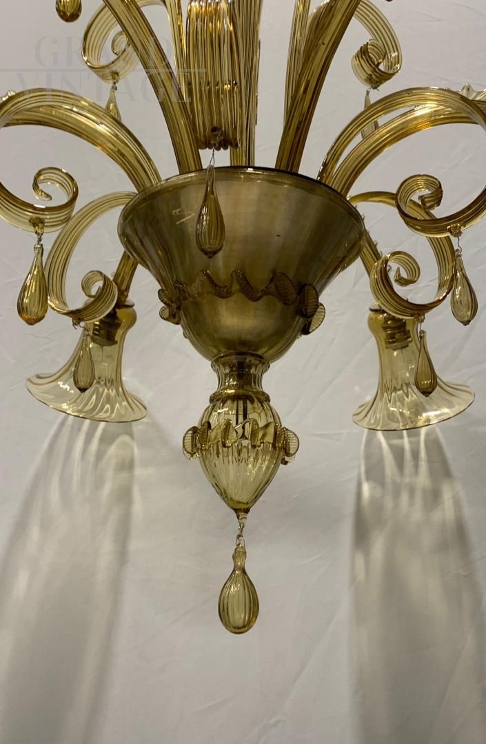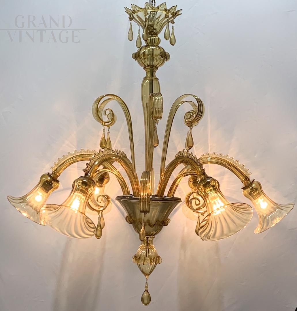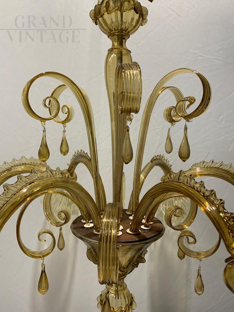 Lampadario attribuito alla ditta Venini in bellissimo vetro di Murano color ambra chiaro trasparente, molto scenografico, raro in queste condizioni. Vetri non crepati, potrebbero avere dei lievi segni del tempo. Il lampadario ha 6 punti luce con attacco per lampadina di tipo E27, ed è stato completamente rielettrificato. Se spedito, verrà smontato per un trasporto sicuro. Volendo si possono utilizzare le lampadine a Led. Ottimo pezzo per lluminare diverse stanze, non abbaglia se vengono montate lampadine bianco latte.
