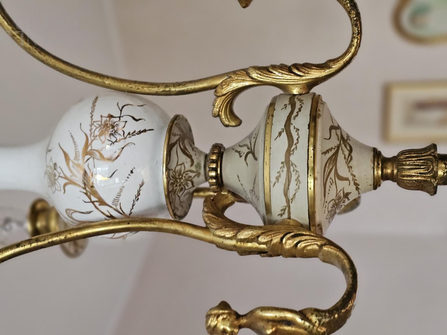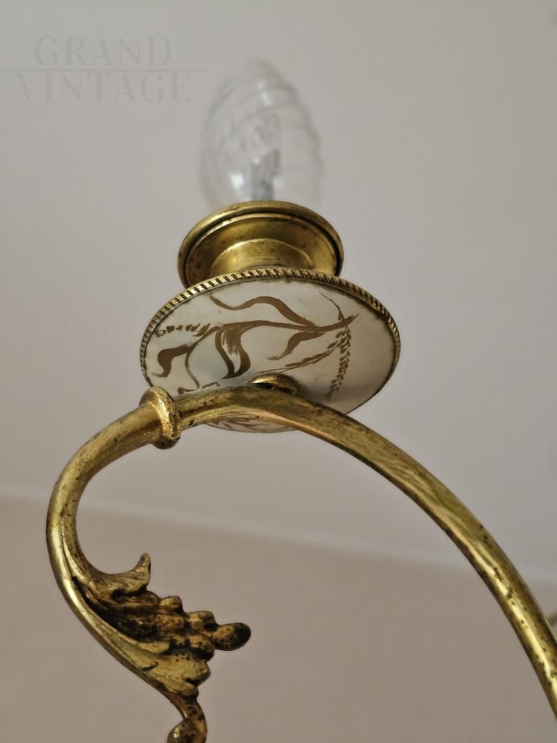 Lampadario vintage a tre bracci in metallo bronzato dorato finemente decorato, con parte centrale in ceramica dipinta a mano a motivo floreale, Italia 1953. Porcellana lavorata a mano con fondo bianco e armoniosi disegni in oro. Porta lampadine con fondello in ceramica con pennellate oro. Disegni molto leggeri e di pregevole armonia grafica. Corpo in metallo con fusioni dorate ben definite e in buono stato. Oggetto molto caratteristico degli anni '50 e con una linea estetica e una colorazione generale chiara e molto gradevole.