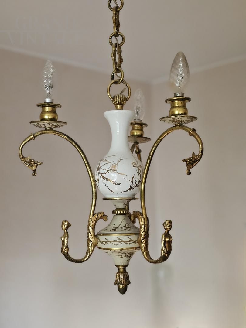 Lampadario vintage a 3 bracci in metallo bronzato e ceramica dipinta