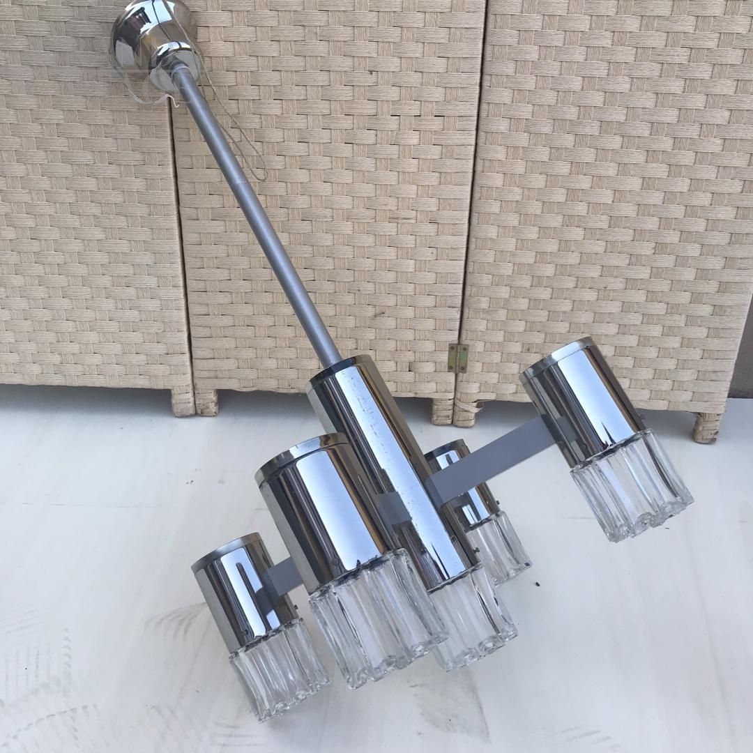 Lampadario modernariato stile Gaetano Sciolari in acciaio e vetro, anni '70, a 5 punti luce. Condizioni perfette, funzionante.