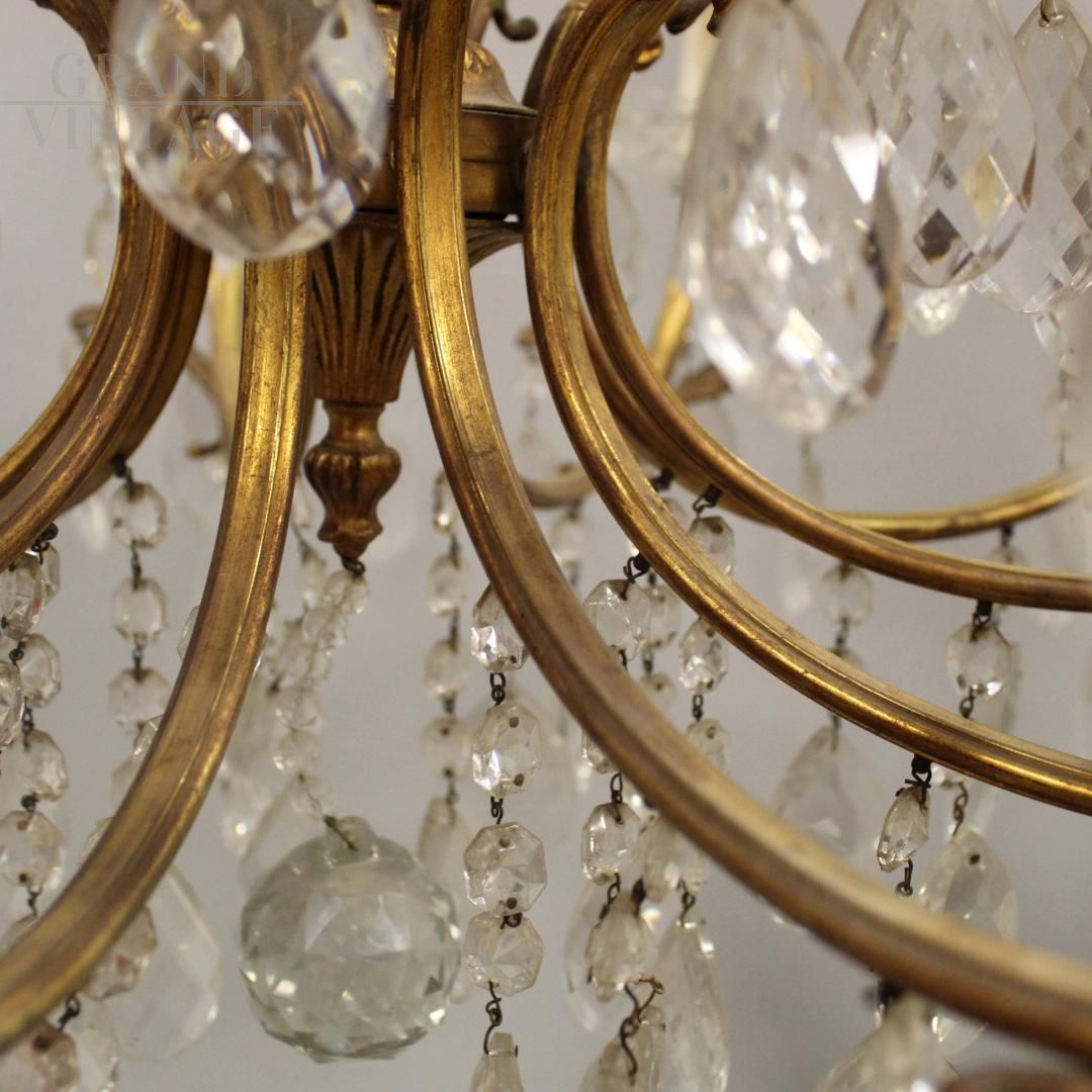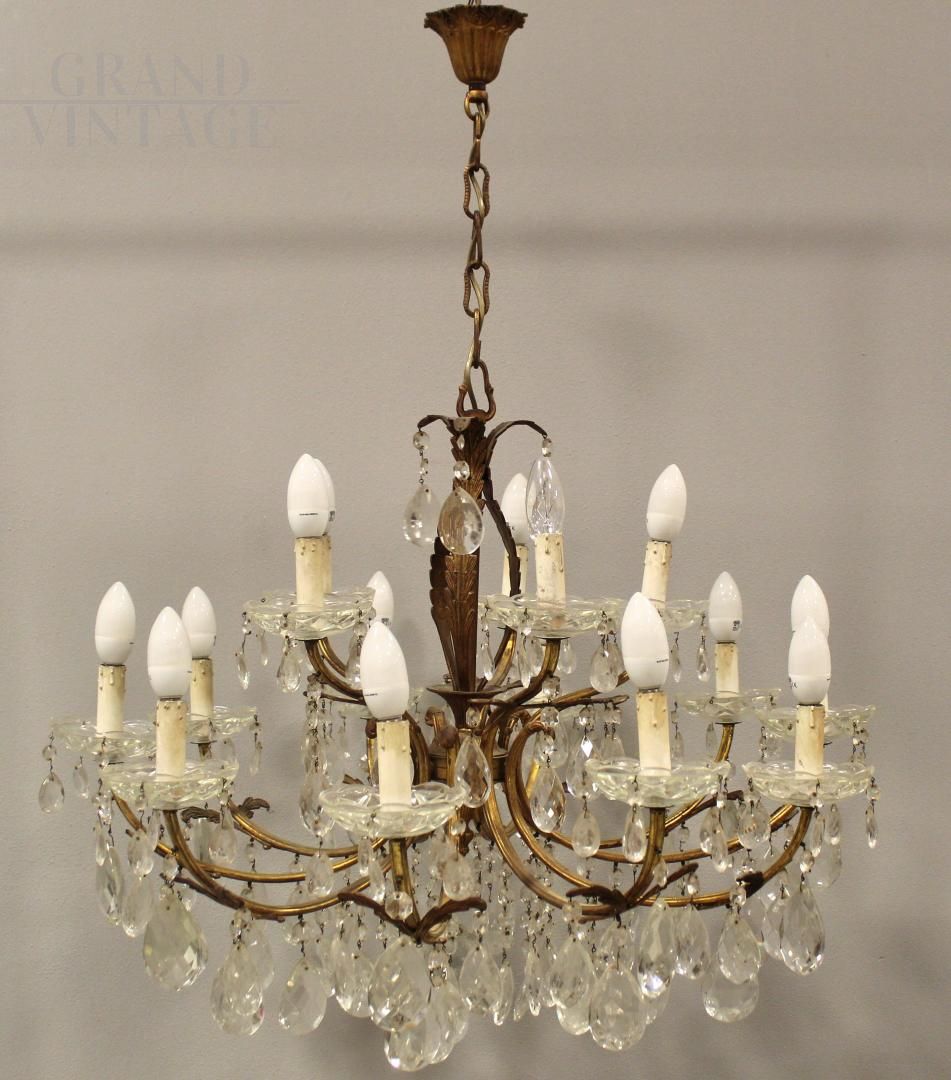 Lampadario con gocce in cristallo a 15 luci della seconda metà del '900, di provenienza italiana.