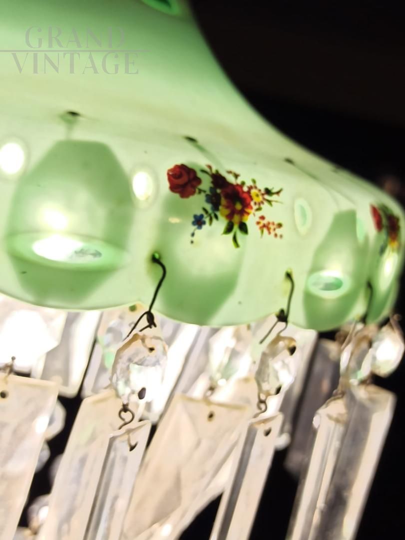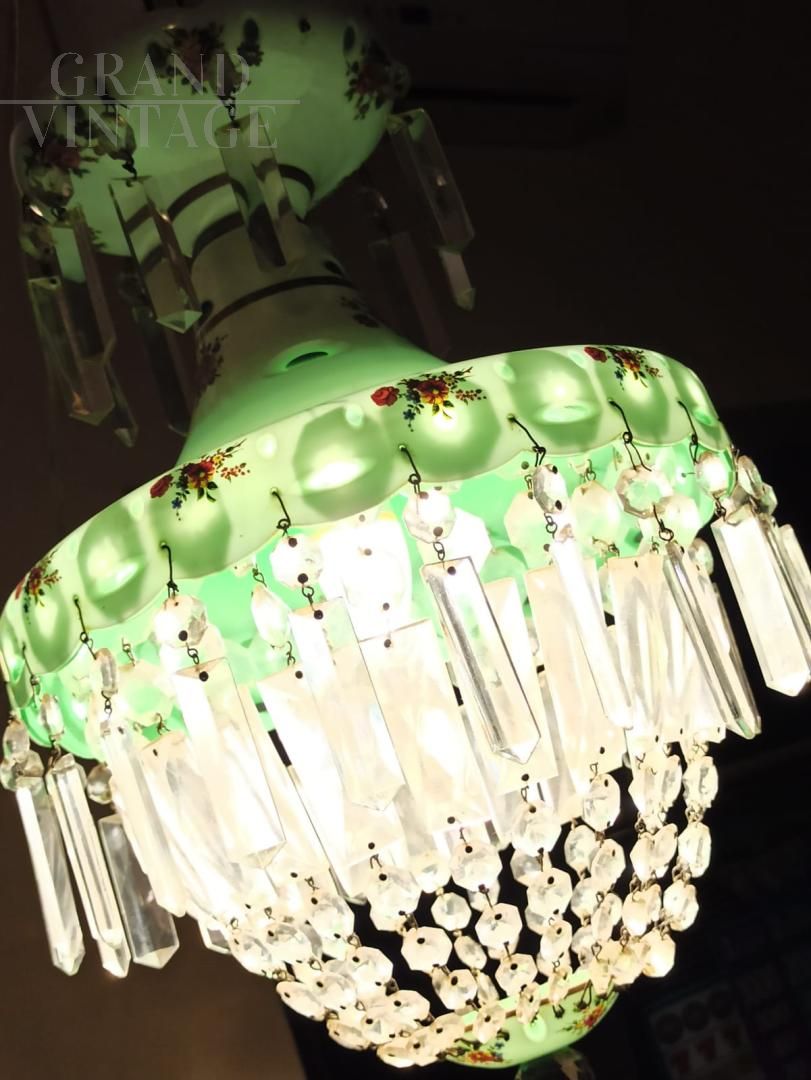 Lampadario brocante da ingresso in vetro decorato e cristallo di provenienza Boemia, anni '50, costituito da due calotte in vetro incamiciato bianco esterno e verde interno, profilate in oro con decorazioni floreali sotto smalto. La cupola superiore cela un portalampade E27 per max 100 watt ed ha una cascata di catene di cristalli di forma ottagonale. Questo lampadario è ideale per l'illuminazione di un ingresso o di un corridoio. Manca un cristallo ad ottagono.