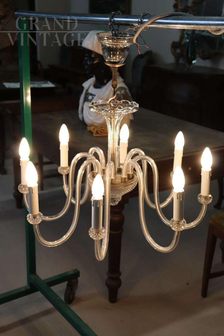 Bellissimo lampadario in vetro di Murano colore trasparente a otto luci, vintage anni '80, molto raffinato nella sua semplicità. In perfette condizioni vintage, ottimo prezzo trattabile.