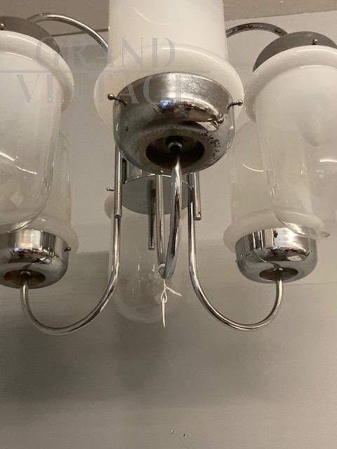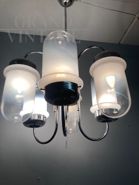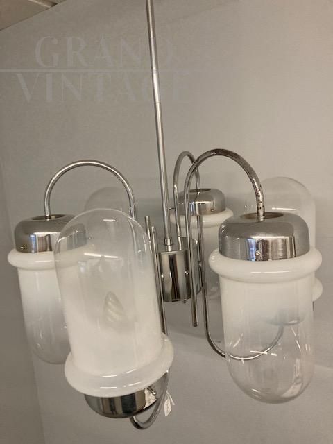 Lampadario vintage anni '70 in vetro di Murano trasparente sfumato bianco con sei luci su struttura cromata. In buono stato, con segni di vissuto nella cromatura. Impianto revisionato.