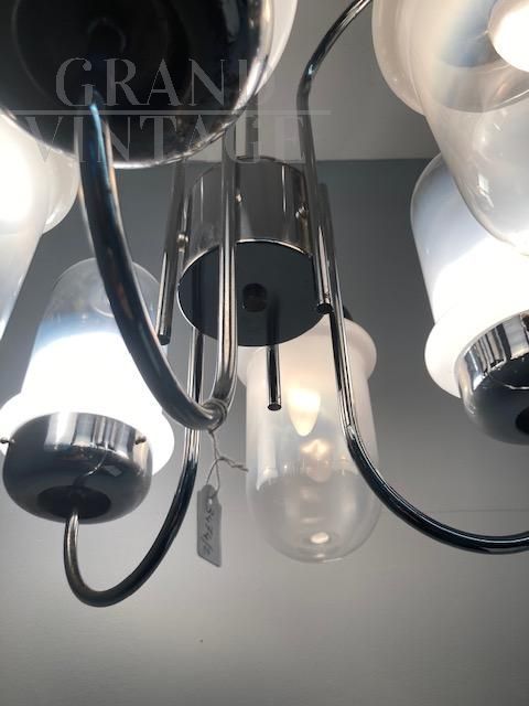 Lampadario vintage in vetro di Murano e metallo cromato a 6 luci, anni '70