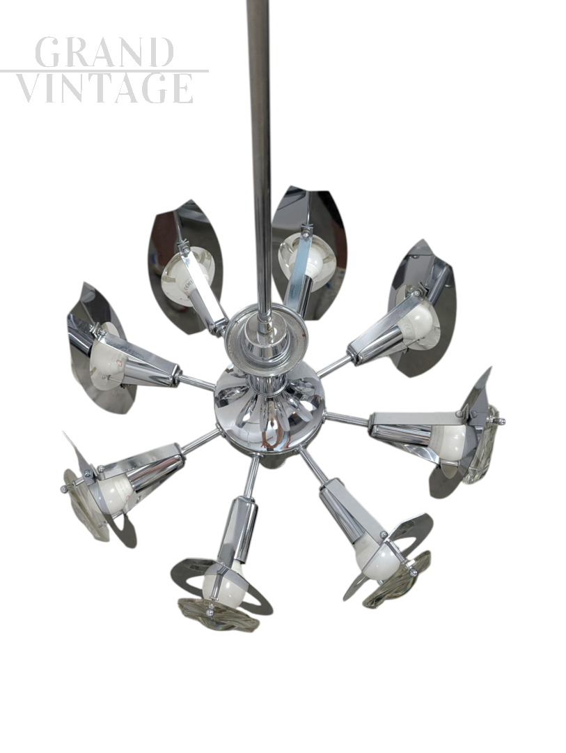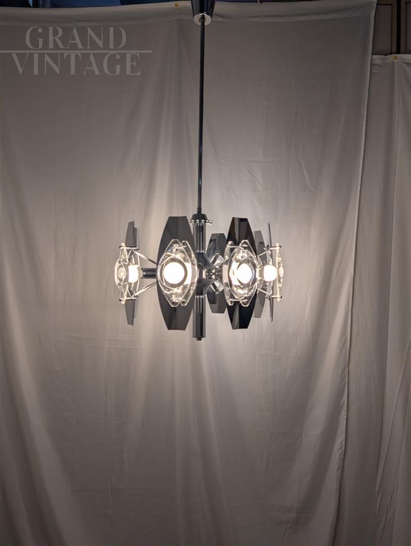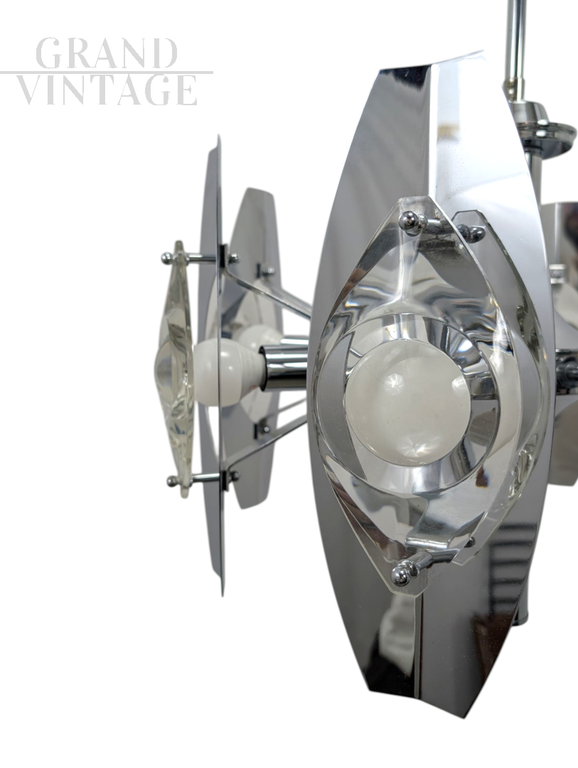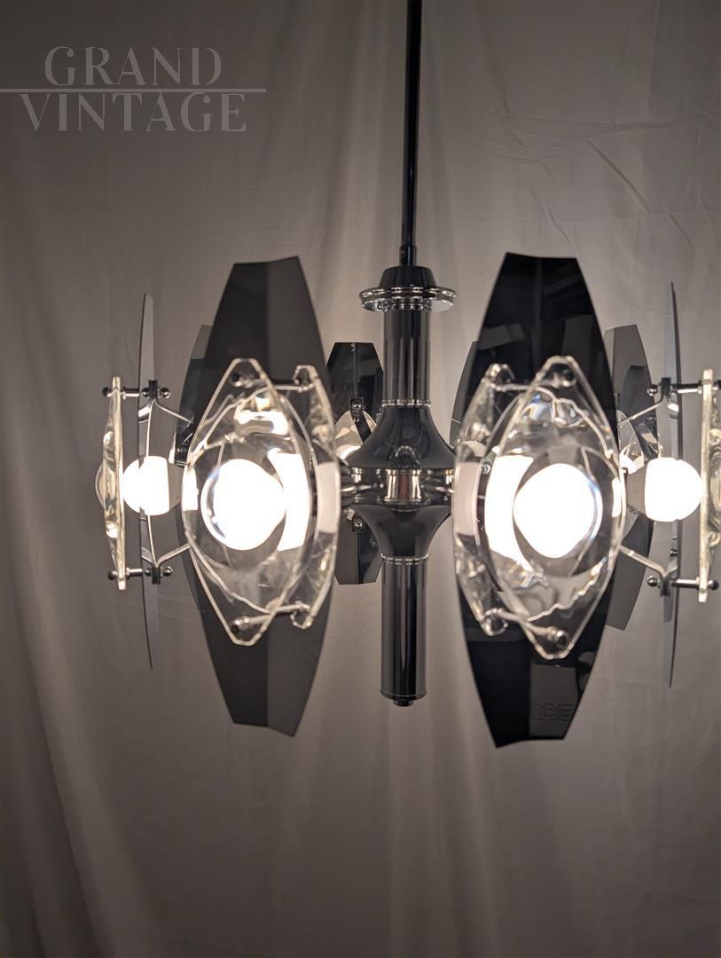 Splendido lampadario cromato del famoso designer italiano Oscar Torlasco. La finitura cromata di alta qualità offre un equilibrio sorprendente tra lucentezza e durata, con uno splendido gioco di forme geometriche e linee pulite che completano qualsiasi interno moderno o contemporaneo. Le condizioni sono ottime, l'impianto elettrico revisionato e portato a nuovo.