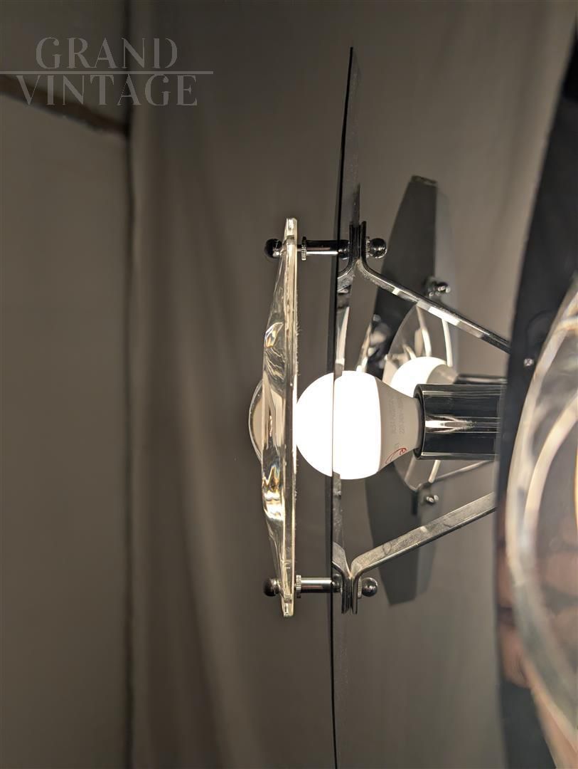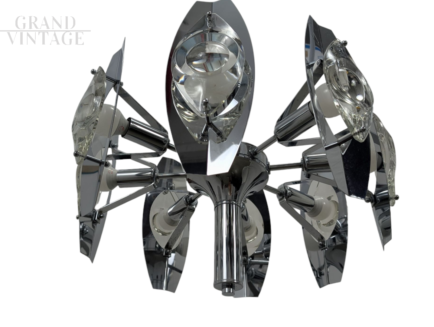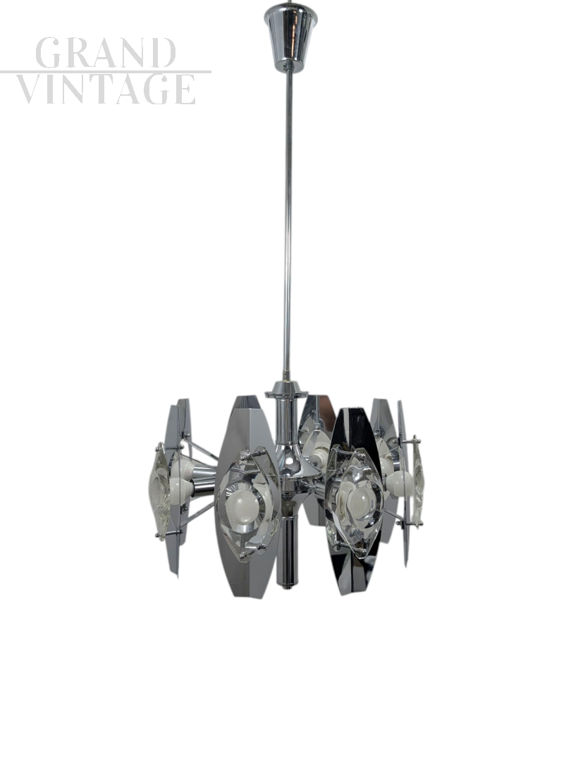 Splendido lampadario cromato del famoso designer italiano Oscar Torlasco. La finitura cromata di alta qualità offre un equilibrio sorprendente tra lucentezza e durata, con uno splendido gioco di forme geometriche e linee pulite che completano qualsiasi interno moderno o contemporaneo. Le condizioni sono ottime, l'impianto elettrico revisionato e portato a nuovo.