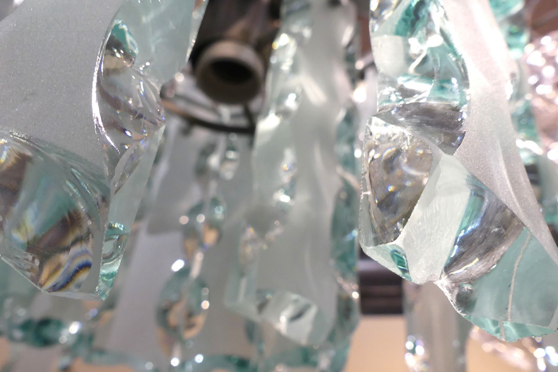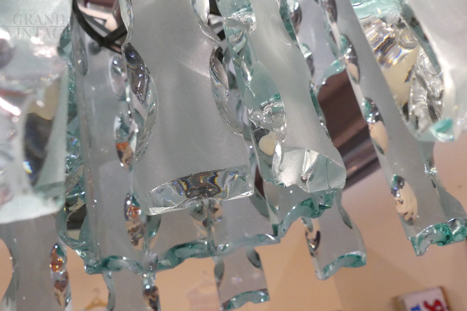 Lampadario vintage Vistosi con lastre di vetro serigrafate in superficie e lavorate ai lati in modo da mostrare delle zone trasparenti dal colore verde acqua, Italia anni '70.