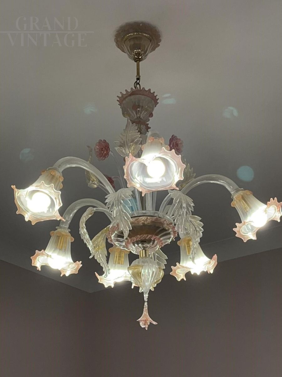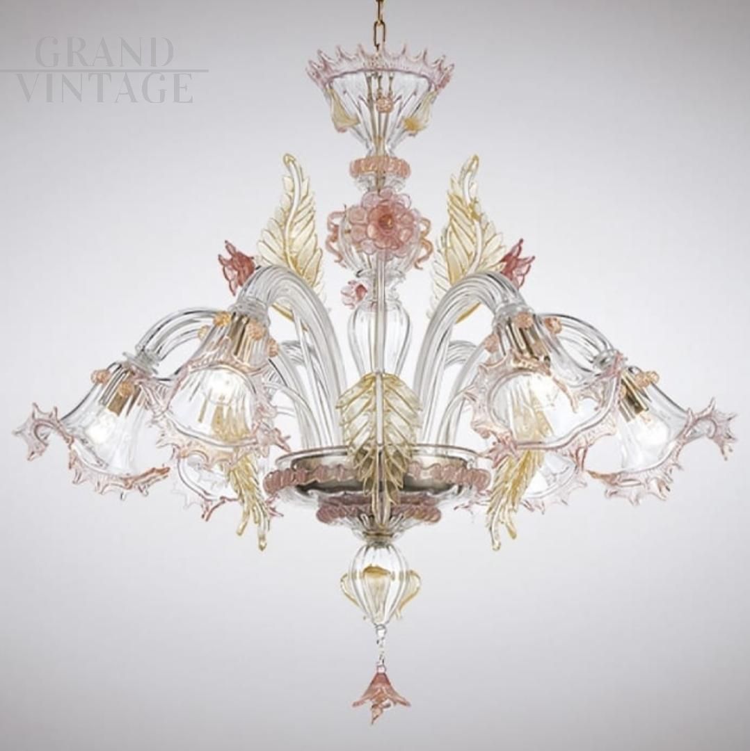 Lampadario La Murrina della collezione Vivaldi, stile contemporaneo, con vetri di Murano color cristallo oro e cristallo oro rosa con finiture in nickel satinato e oro satinato. Creato artigianalmente secondo la tradizione La Murrina, con linee semplici impreziosite da decori unici nel loro genere.