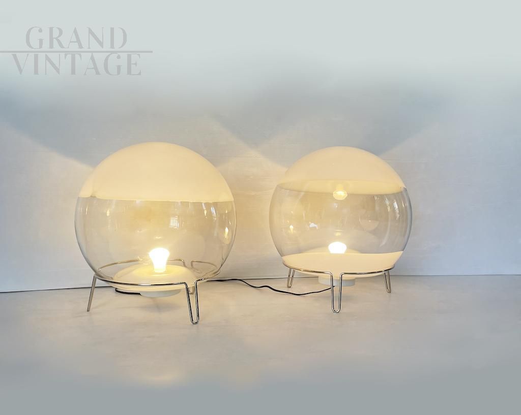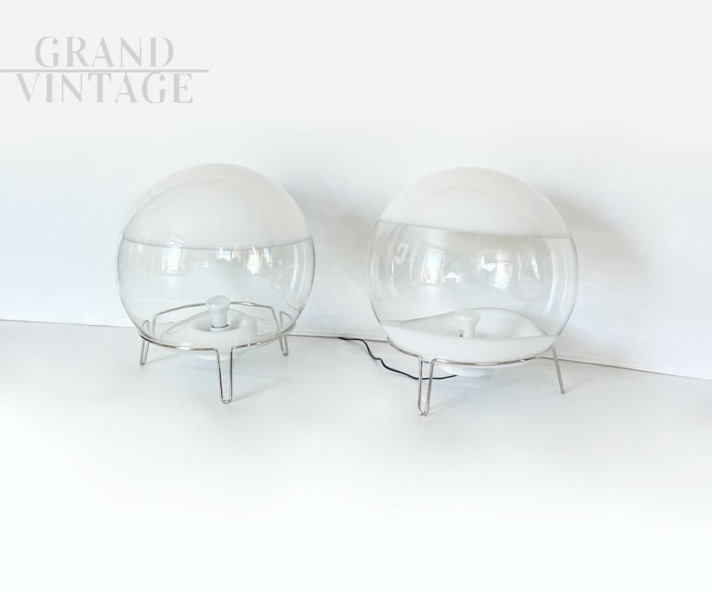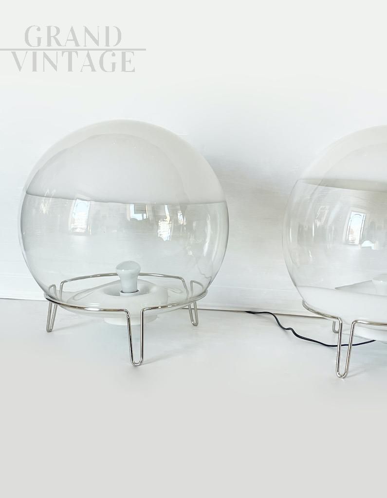 Lampade da tavolo in stile Sfera attribuibili ad Angelo Mangiarotti per Skipper, Italia 1970, interamente realizzate in vetro di Murano trasparente e bianco. Il paralume sferico poggia su una struttura in tondino di metallo cromato. La sfera presenta il punto luce alla base e può essere ruotata sulla struttura per orientare la luce a piacimento. Disponibili 2 pezzi, il prezzo si riferisce alla singola lampada.