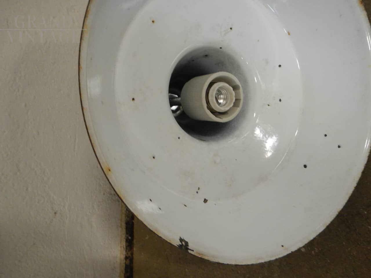 Lampada a sospensione vintage industriale in metallo nero con interno bianco e gancio in ceramica, impianto elettrico funzionante con attacco lampadina E27. Presenti naturali segni d’uso.