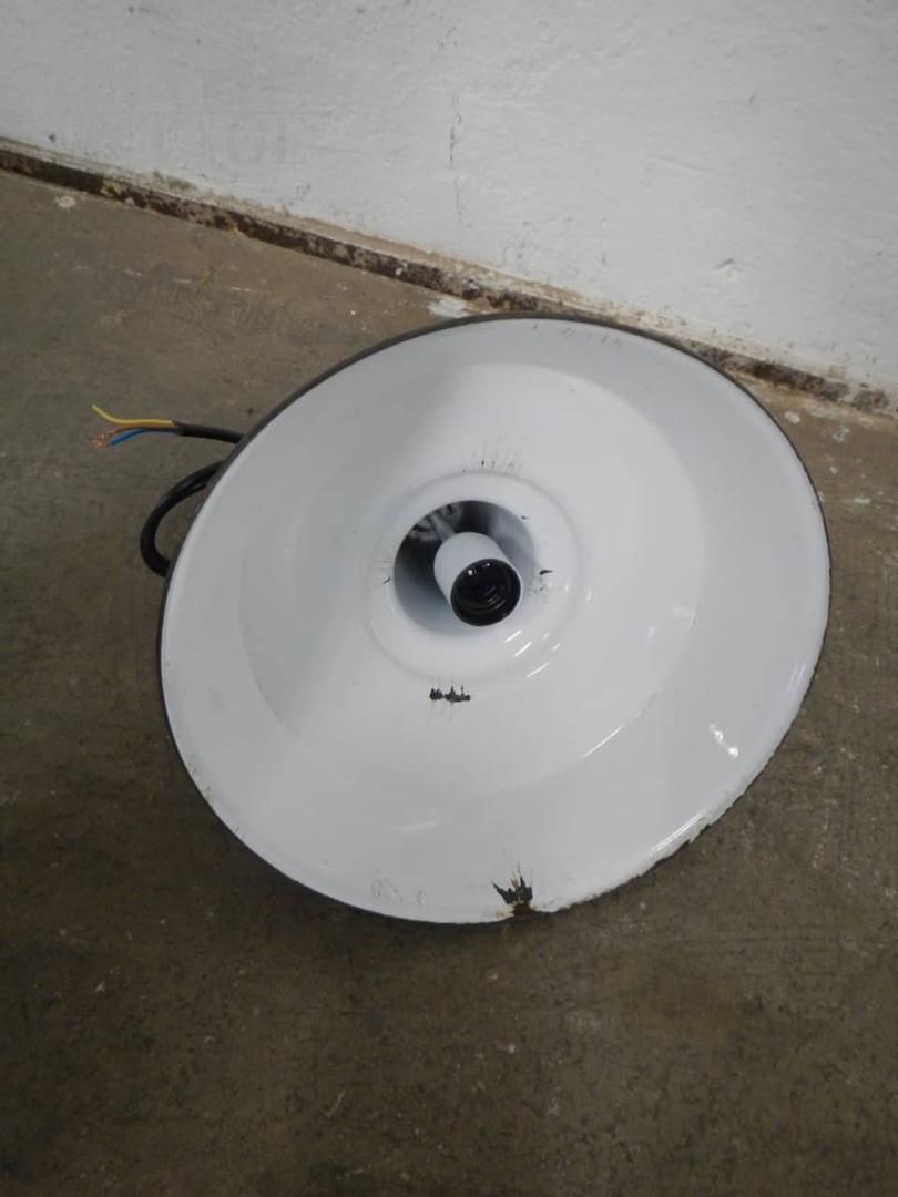 Lampade industriali a sospensione in metallo nero con interno bianco e gancio in ceramica, impianto elettrico funzionante con attacco lampadina E27. Segni d’uso evidenti, che ne arricchiscono il fascino.