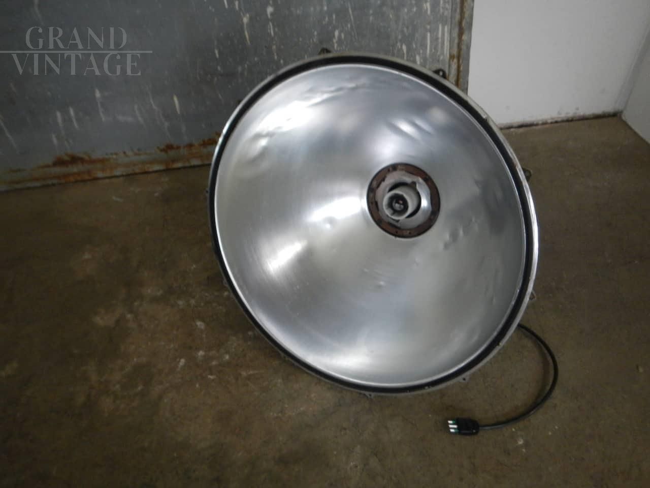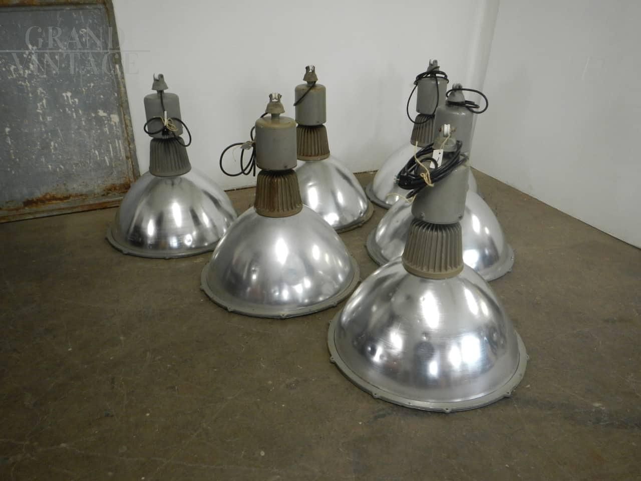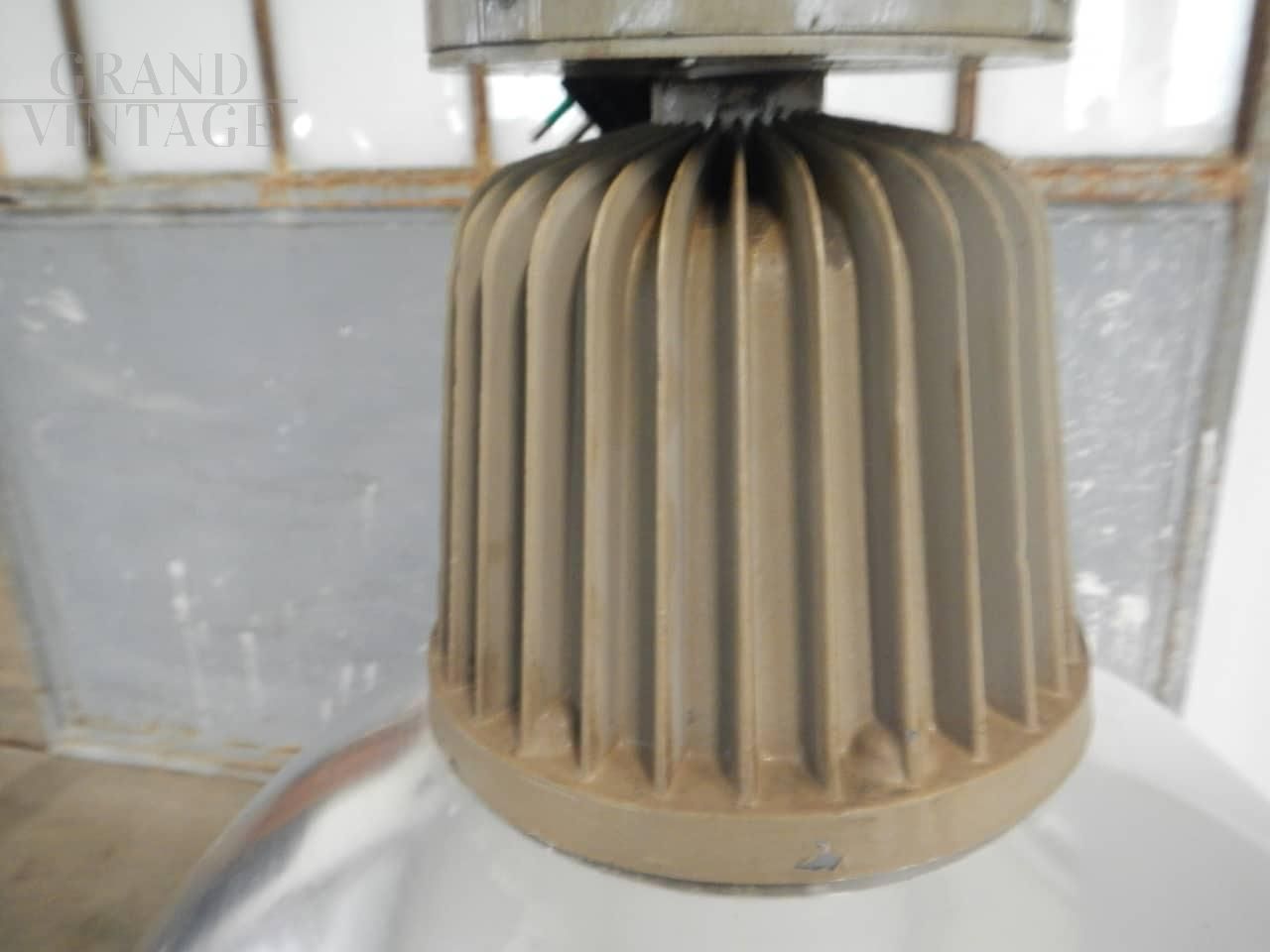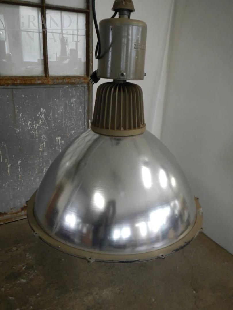 Lampade a sospensione industriali anni '70 della ditta Zetalux Milano, con grande paralume in metallo cromato, ricablate e funzionanti, con attacco lampadina E 27. Il prezzo si riferisce alla singola lampada.