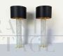Eleganti lampade da tavolo vintage con struttura in splendido vetro di Murano traforato trasparente, base e dettagli sono in ottone dorato, il paralume in tessuto nero con interno oro lucido, perfette per illuminare uno stile Hollywood Regency. Disponibili due pezzi, il prezzo si riferisce al singolo pezzo.