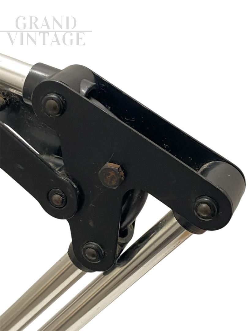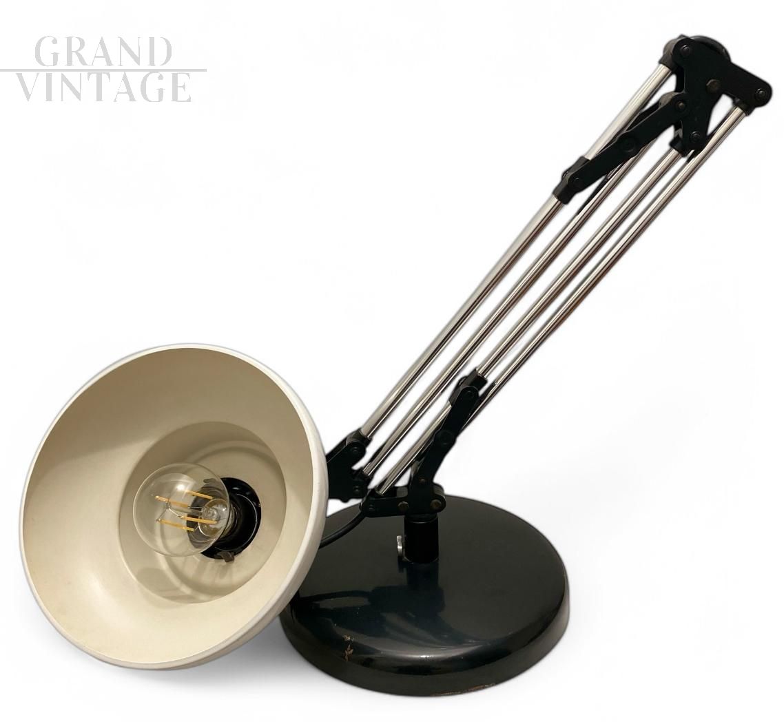Cette lampe de table comporte un bras réglable et un diffuseur en métal. Le diffuseur mesure 20 cm de diamètre. Légères traces d'usure. L'interrupteur arrière est un peu cassé mais fonctionne. Pour allumer ou éteindre la lampe il faut le tourner .