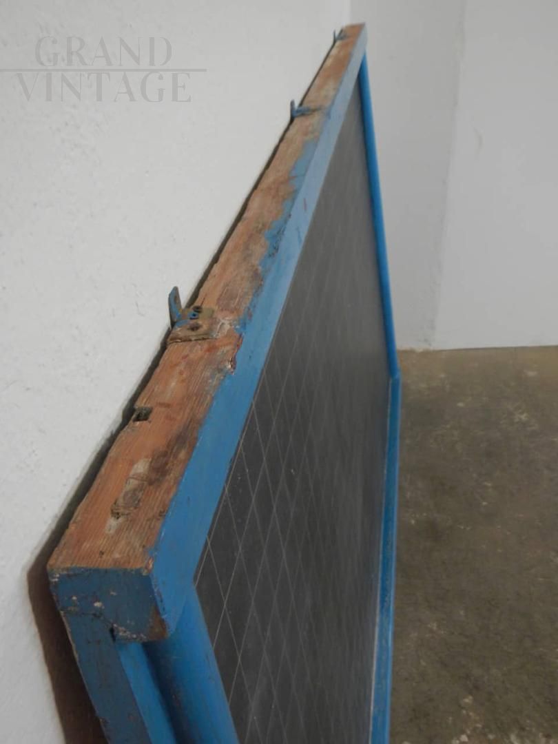 Lavagna scolastica vintage da parete in ardesia a quadretti con cornice in legno di abete colorato blu, completa di ganci per appenderla e supporti in ferro.