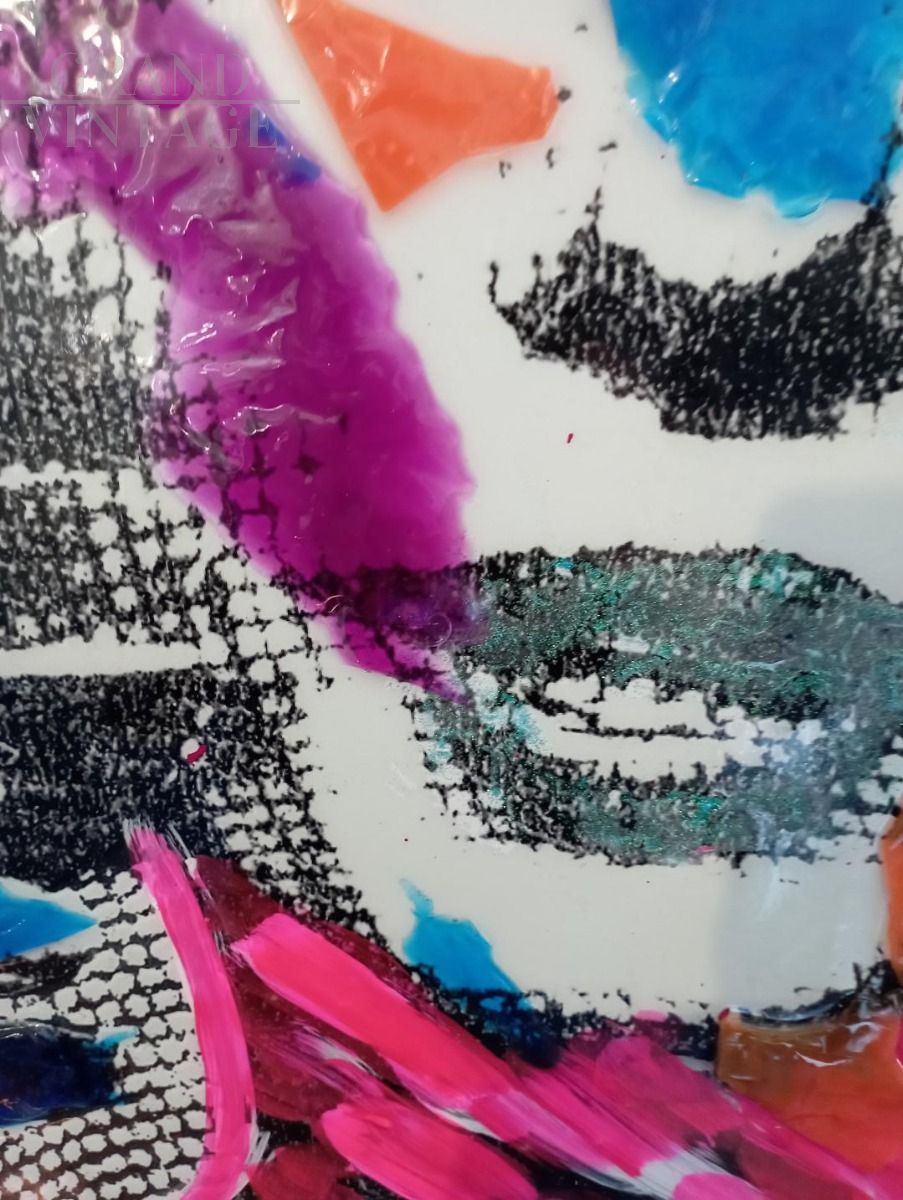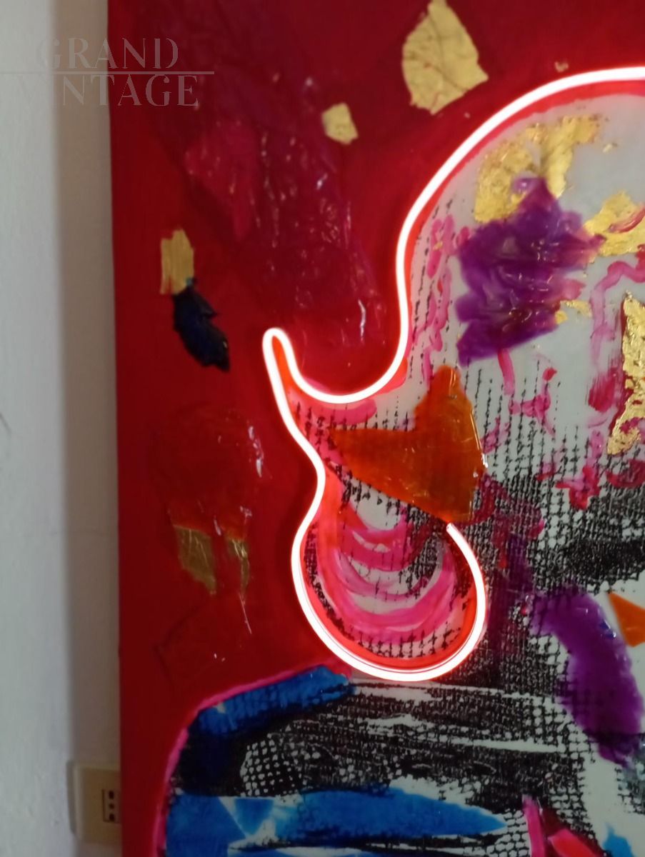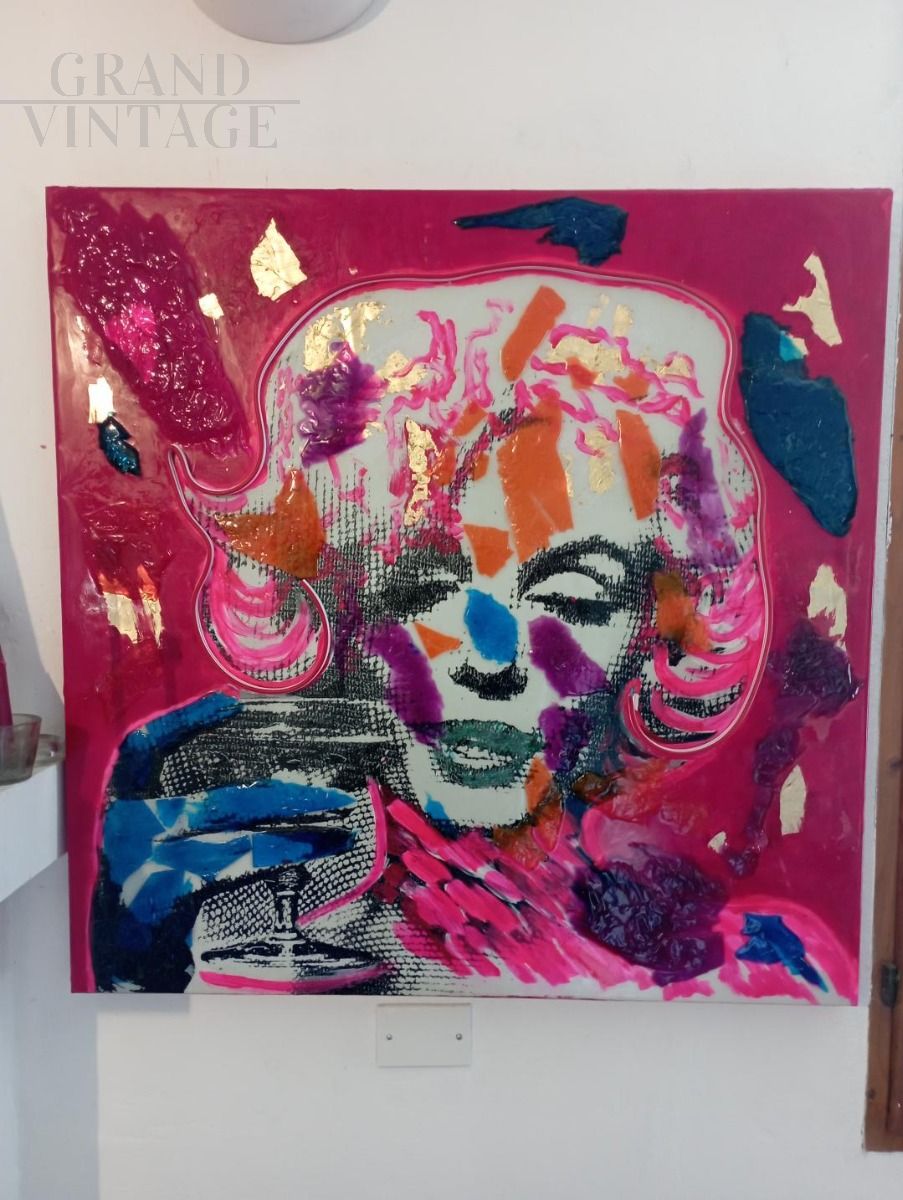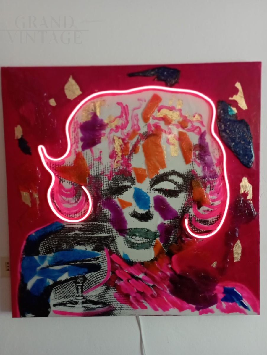 Dipinto a tecnica mista di Rolando Pellini raffigurante l'icona Marilyn Monroe, rappresentata con collage, resine e colori acrilici, con illuminazione a led rosa di 220 volt che incornicia la sua sagoma, cavo di alimentazione di 4 mt compreso.