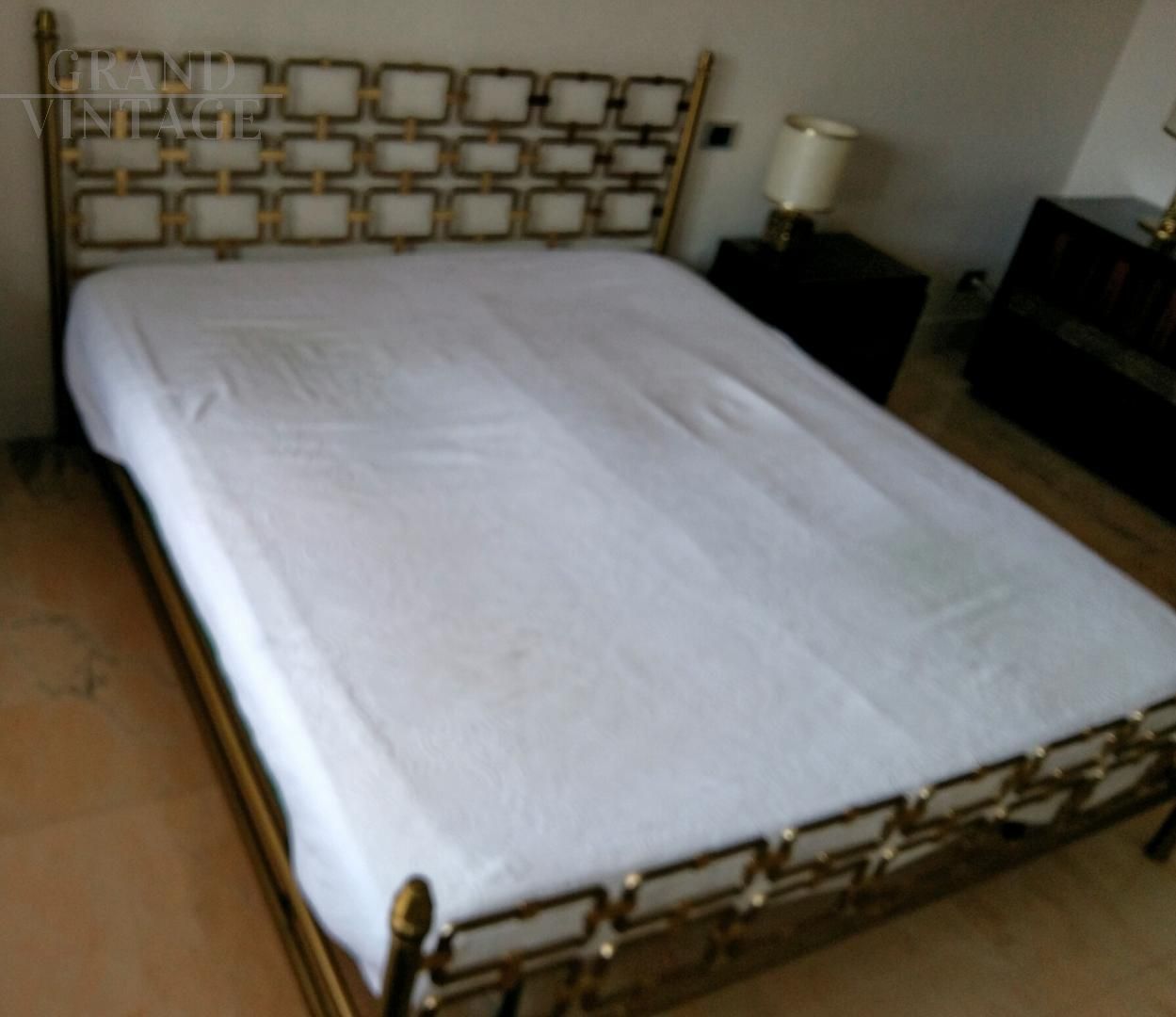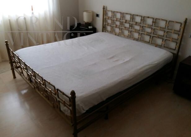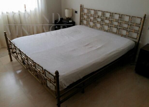 Letto matrimoniale completo di testata e pediera in ottone, modello Regine di Luciano Frigerio, in buone condizioni. La parte superiore sia della testata che della pediera sono in ottime condizioni, mentre la parte bassa (i piedi) della pediera presentano i naturali segni del tempo e dell'usura.