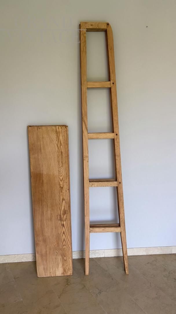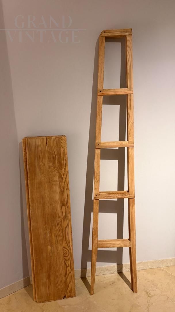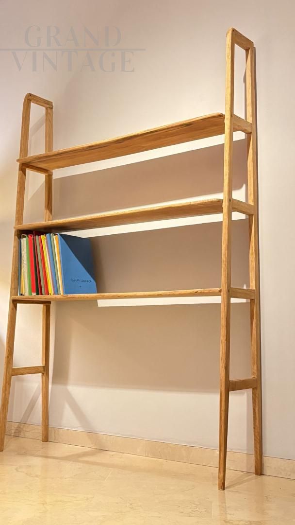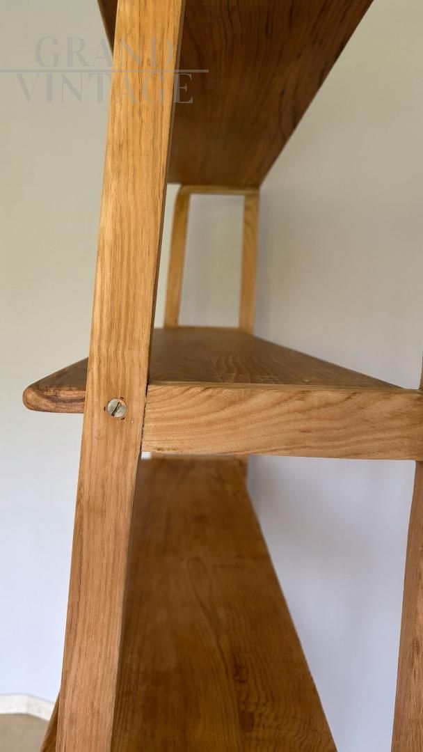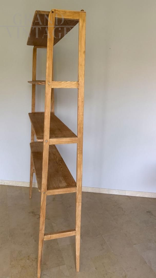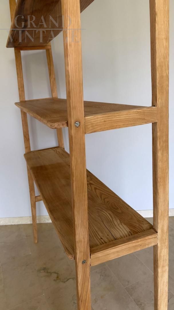 Libreria a scaletta vintage in legno chiaro con scaffali a giorno, artigianato made in Italy anni '50. Splendida libreria artigianale in stile mid-century realizzata a mano da un artigiano italiano dell’epoca. Un pezzo unico, autentico, interamente in legno massello e dal design essenziale ma ricercato. Dotata di 4 ripiani, offre ampio spazio per libri, oggetti decorativi o vinili, e si adatta perfettamente a interni moderni, vintage o minimalisti. La struttura inclinata la rende visivamente leggera ma stabile, ideale sia appoggiata alla parete che come elemento d’arredo indipendente.