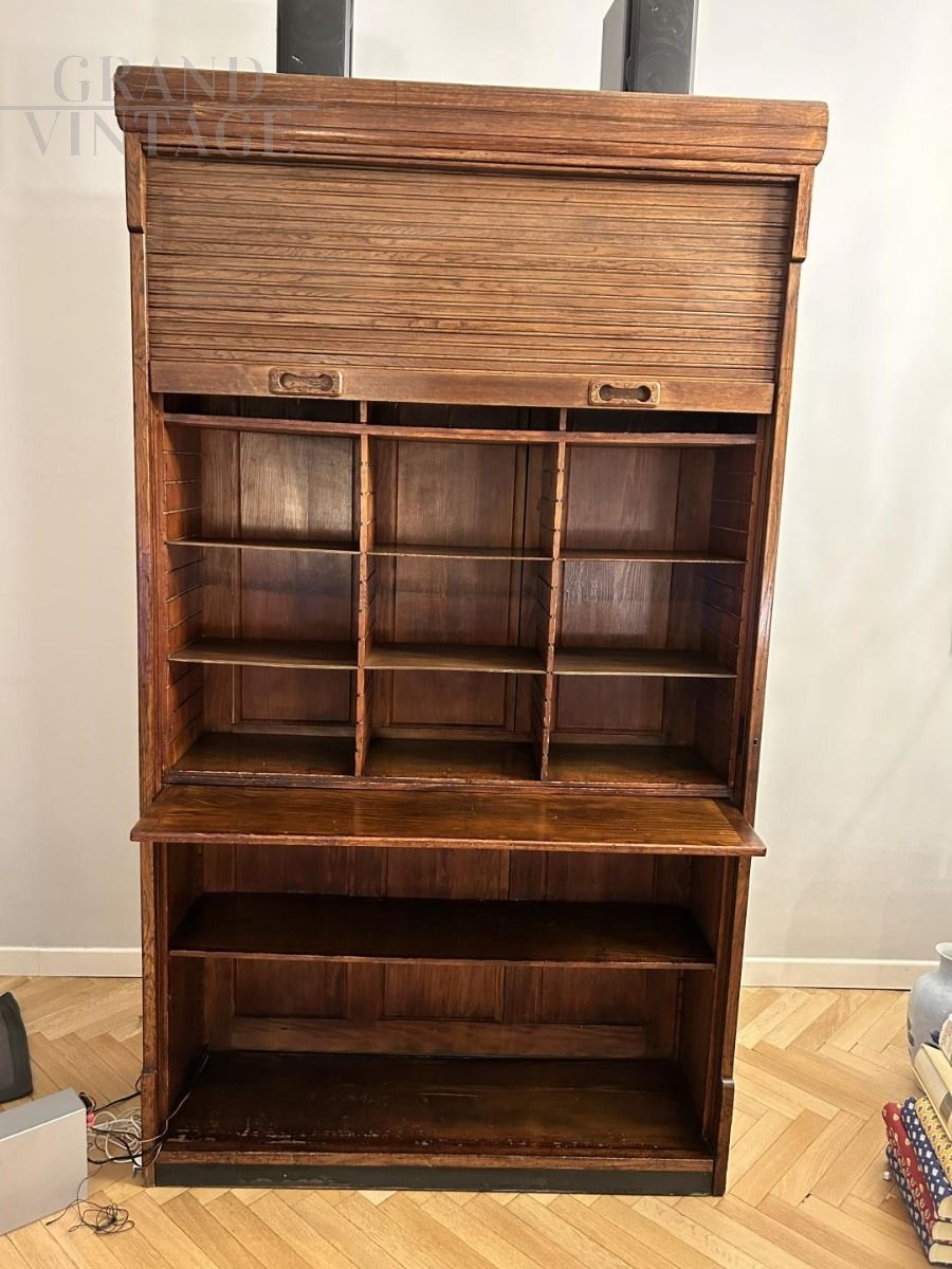 Libreria da ufficio antica in legno con chiusura a serranda dei primi '900, molto bella e tenuta molto bene, presenta una mensola a scomparsa per appoggiare un libro o qualsiasi oggetto, o da utilizzare come piano scrittoio.