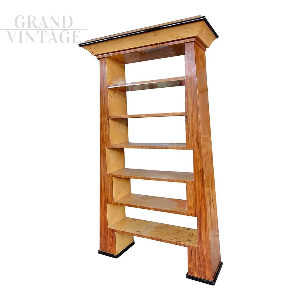 Libreria art déco a giorno dalla particolare forma a trapezio, realizzata in mogano e radica di betulla con finiture laccate nere, dotata di sei ripiani.