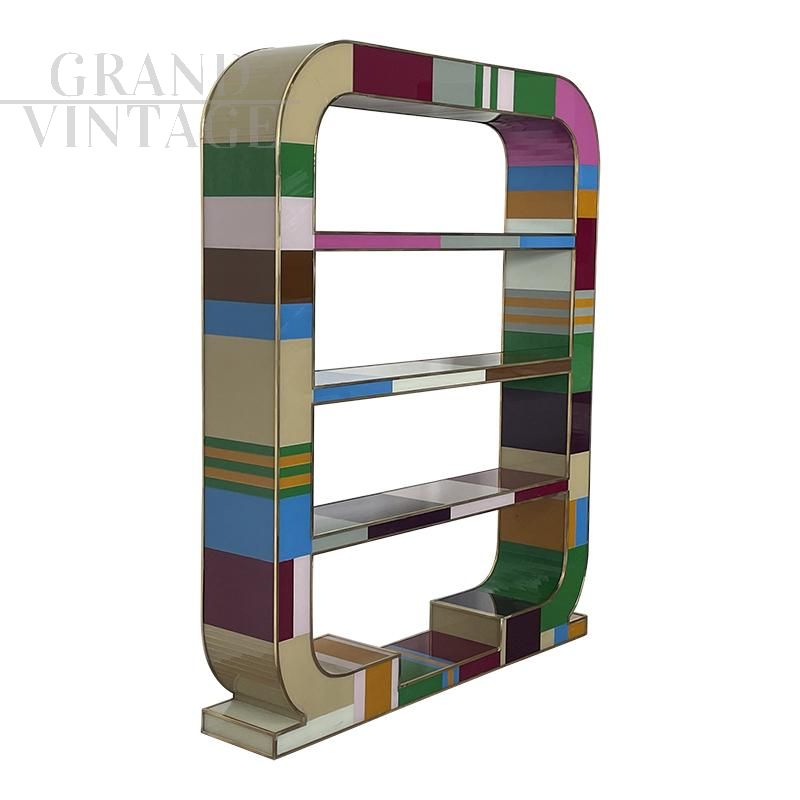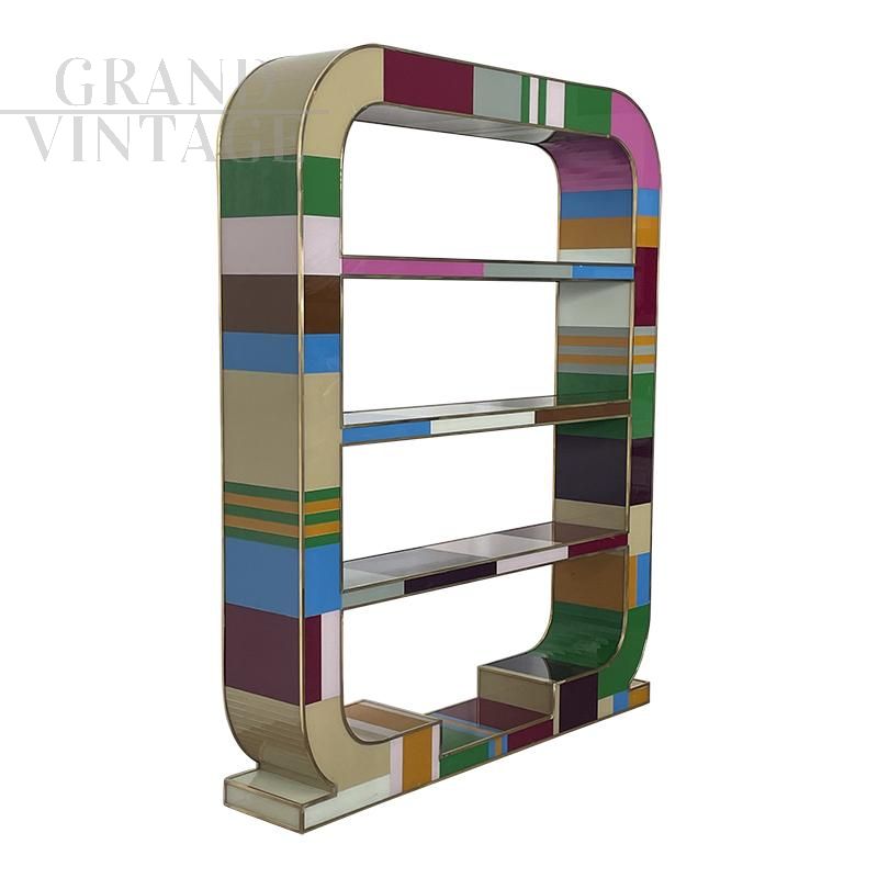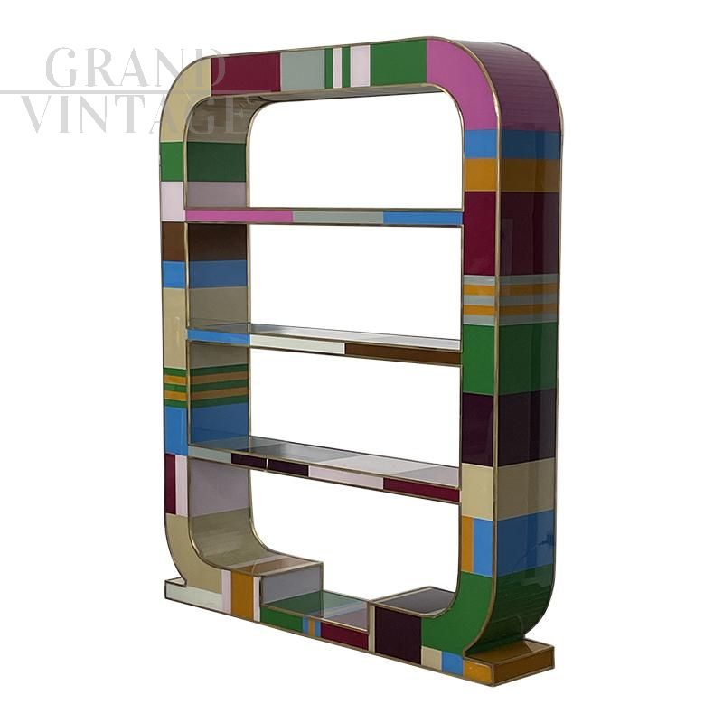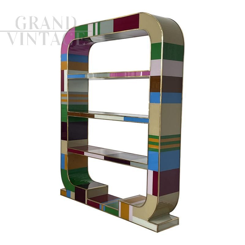 Libreria bifacciale di linea Art Dèco, interamente realizzata a mano, con quattro ripiani a giorno, struttura in legno rivestito in tessere di vetro di Murano multicolore, profili in ottone dorato. Dimensioni: larghezza 162,5 cm, profondità 31,2 cm, altezza 203 cm.