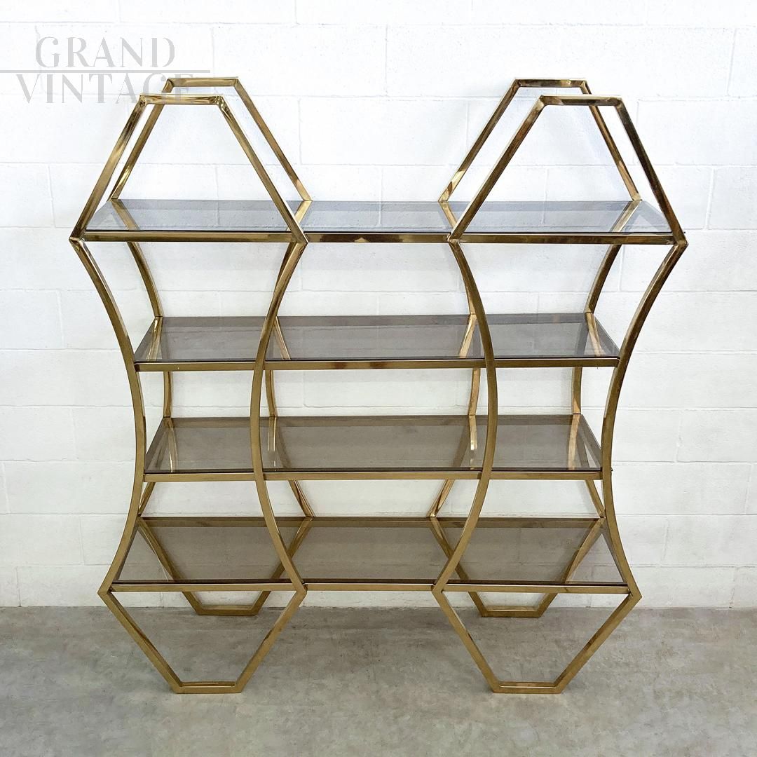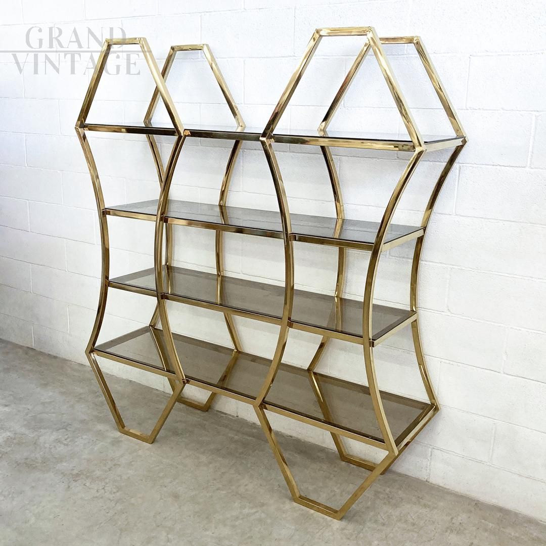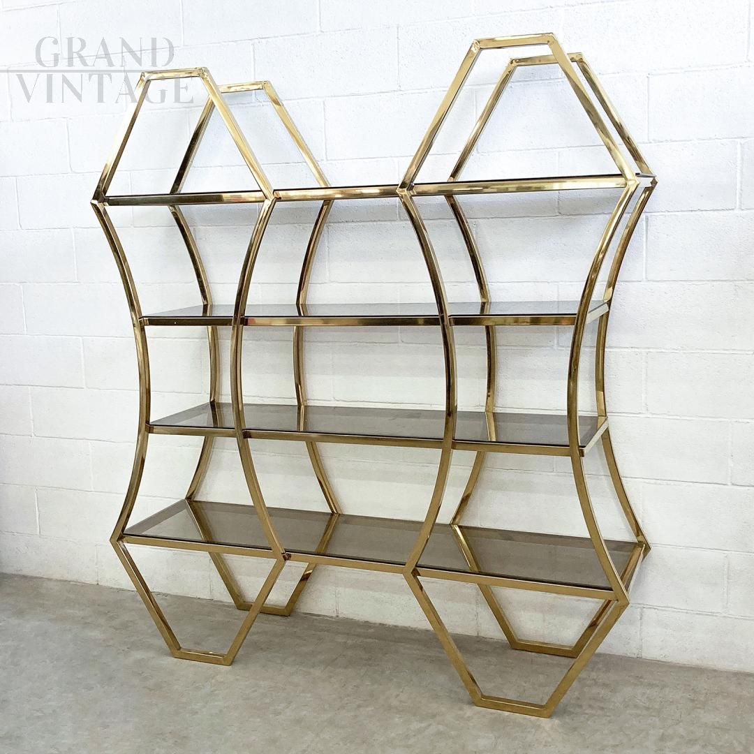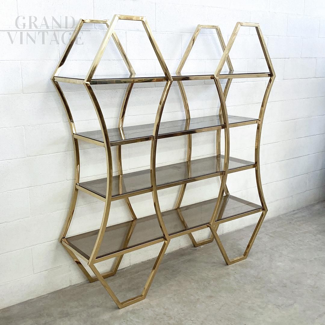 Libreria design a 4 ripiani in ottone dorato e vetro fumé