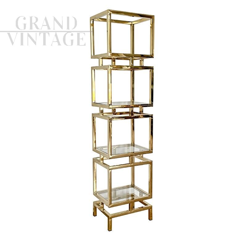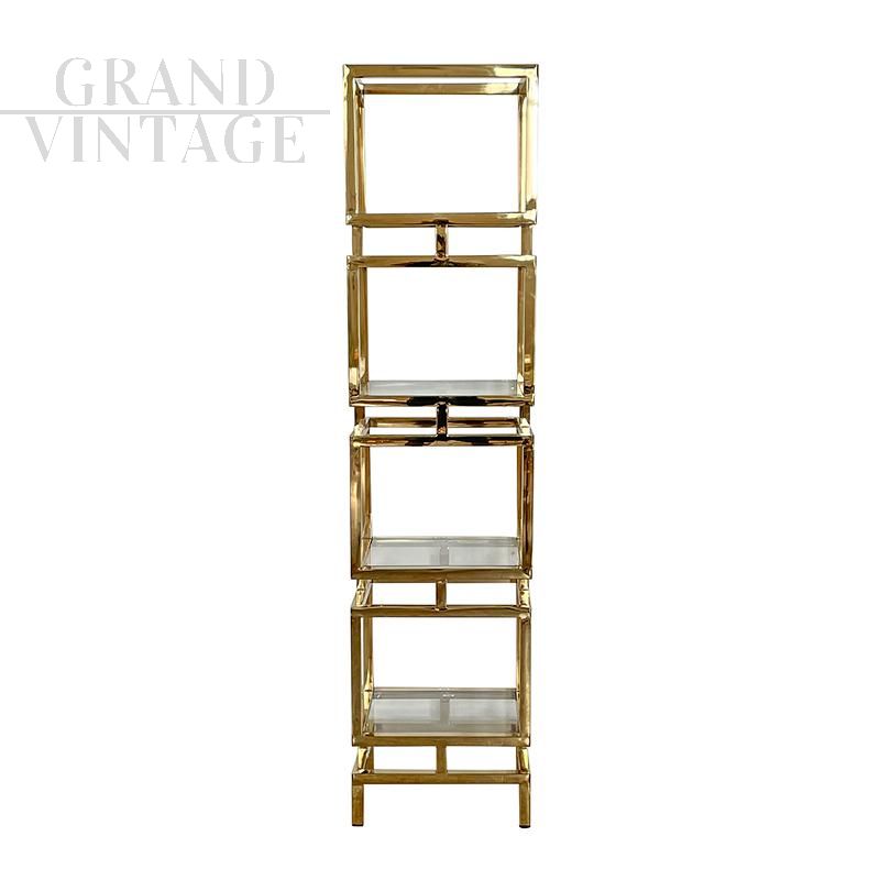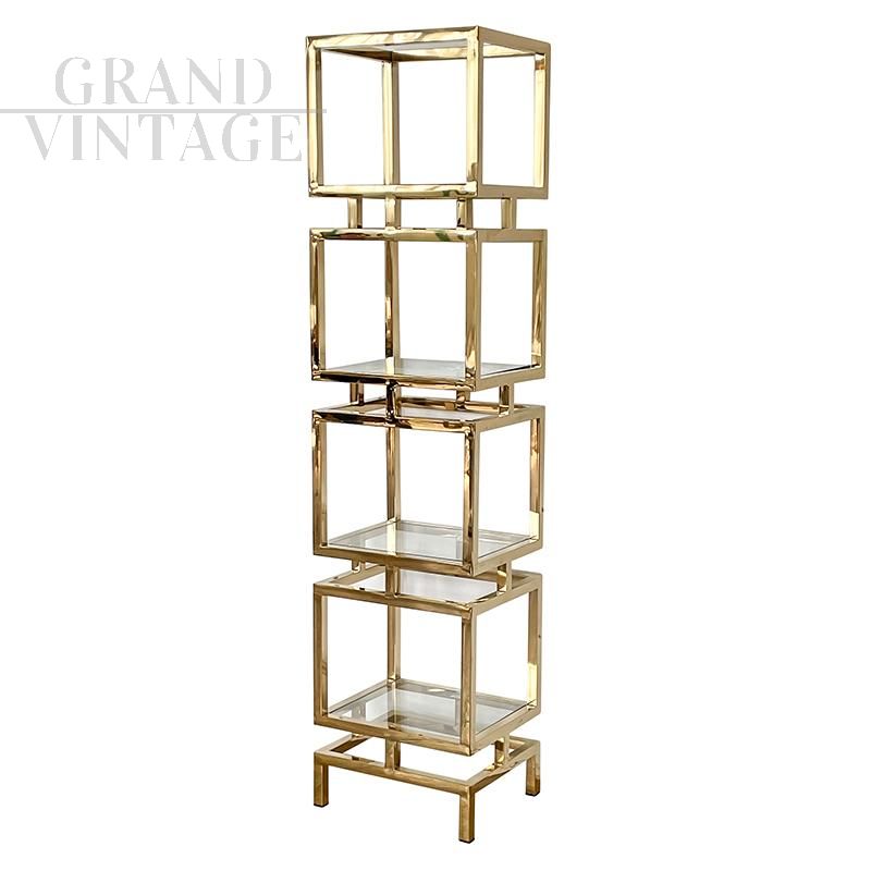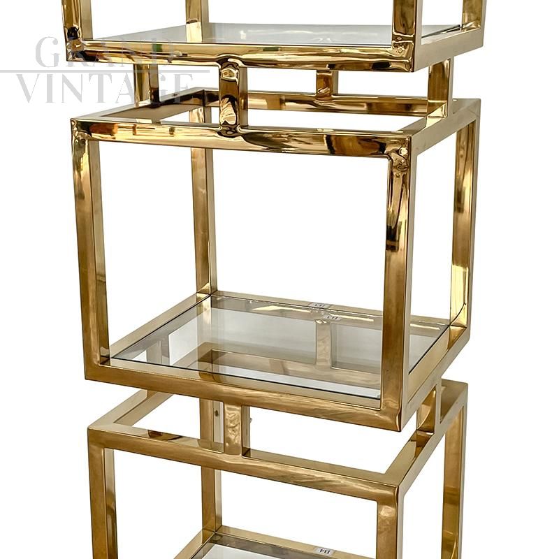 Magnifica libreria o espositore design in tubolare di ottone dorato a sezione quadrata con quattro ripiani in vetro.