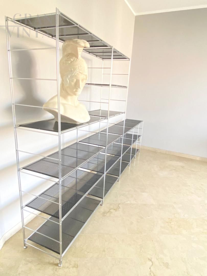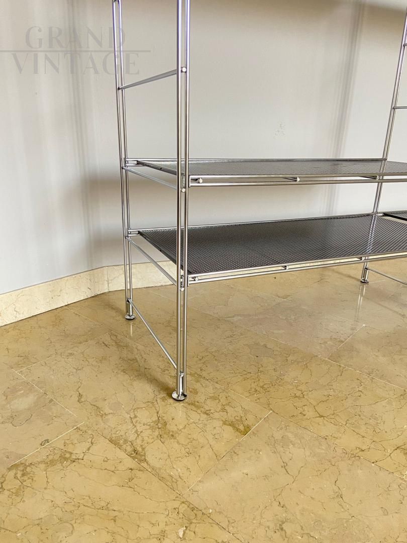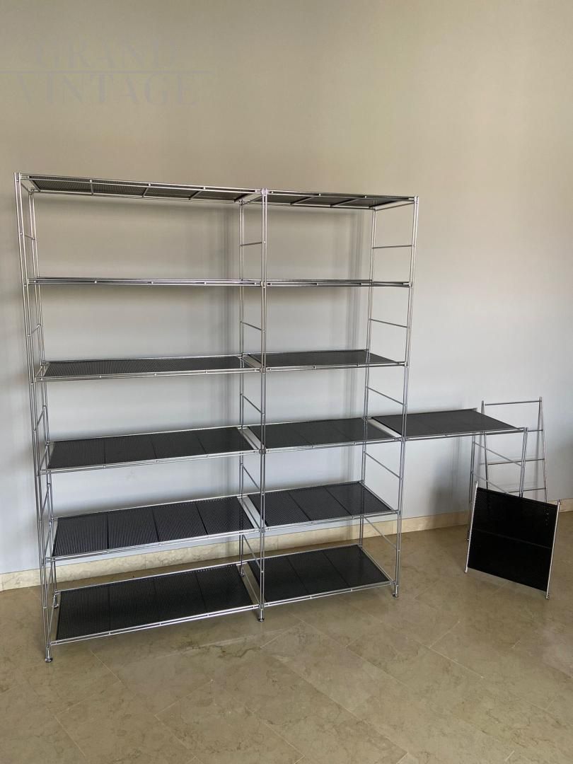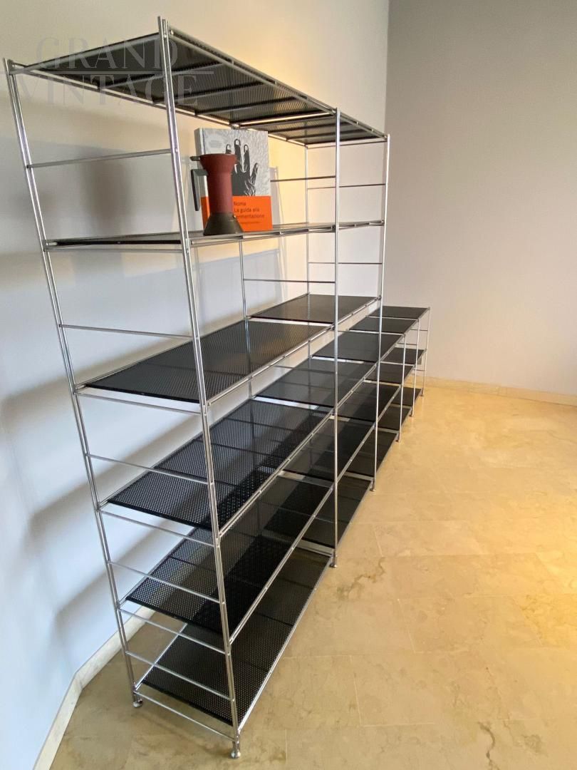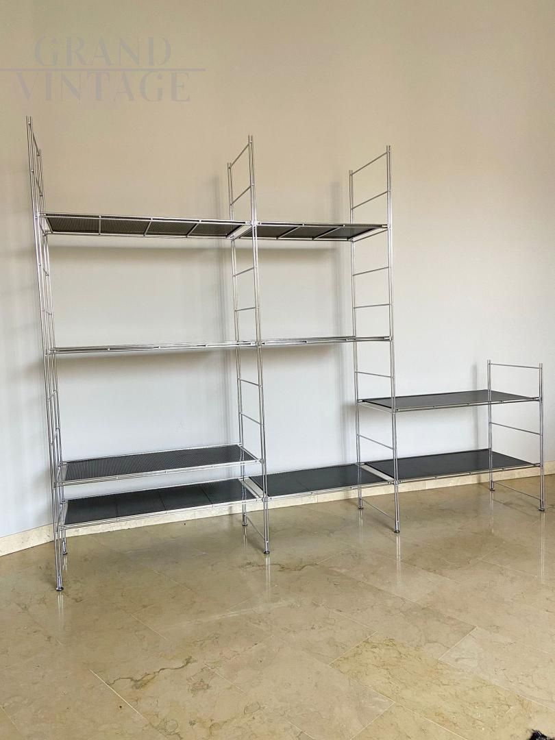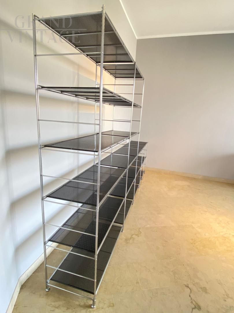 Libreria design componibile in metallo, Italia anni '70, con struttura e in metallo cromato e ripiani in rete metallica laccata di colore nero, auto reggente grazie ai piedini metallici che sostengono a terra tutta la struttura. La larghezza massima è di 3 metri, ma essendo componibile si può accorciare creando altri ripiani separati dalla struttura principale. Molto versatile e adattabile a qualsiasi spazio.