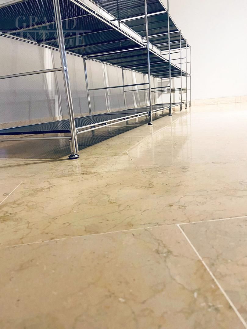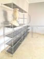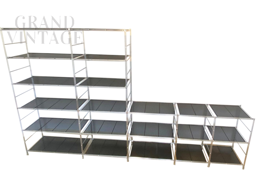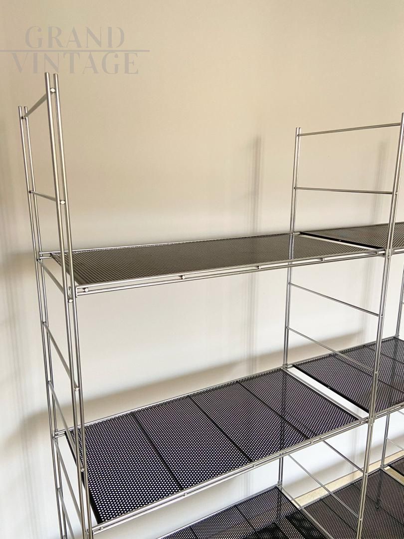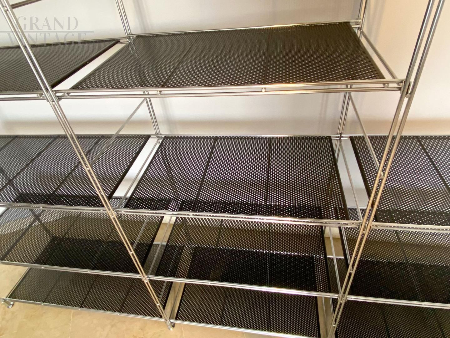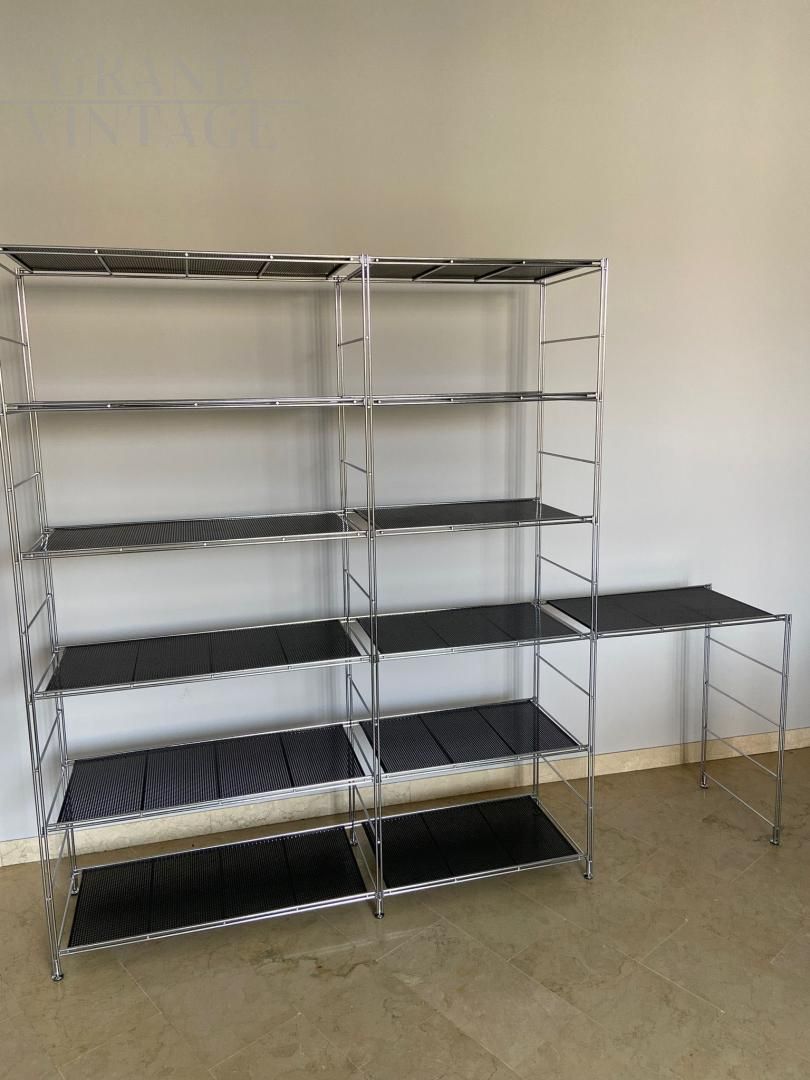 Libreria design componibile in metallo, Italia anni '70, con struttura e in metallo cromato e ripiani in rete metallica laccata di colore nero, auto reggente grazie ai piedini metallici che sostengono a terra tutta la struttura. La larghezza massima è di 3 metri, ma essendo componibile si può accorciare creando altri ripiani separati dalla struttura principale. Molto versatile e adattabile a qualsiasi spazio.