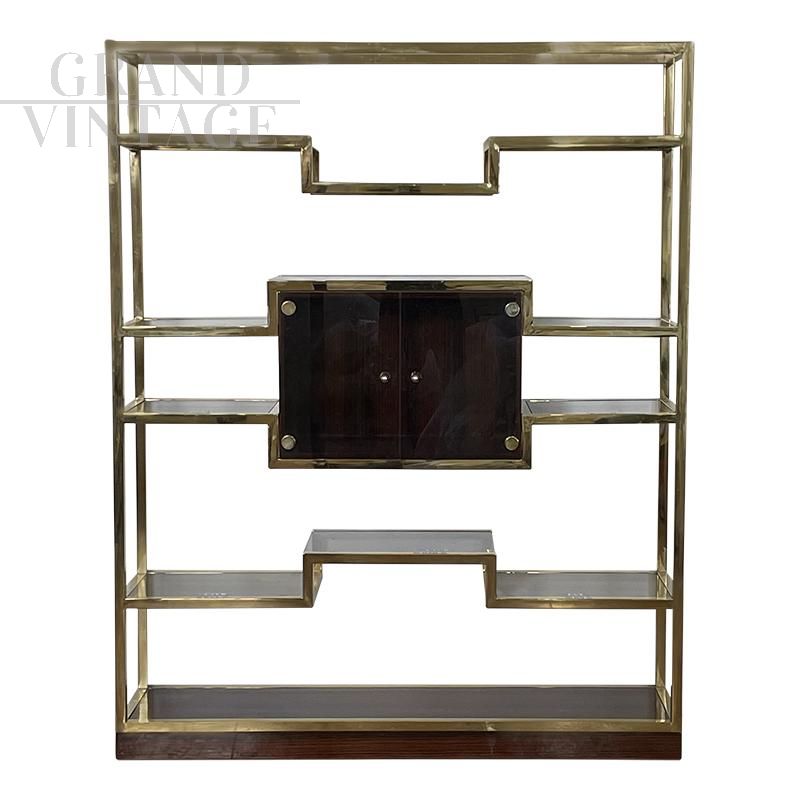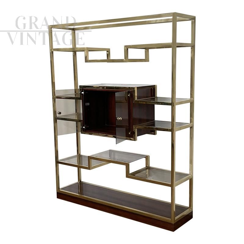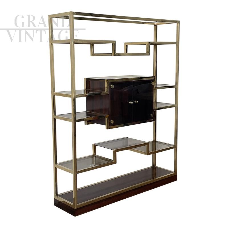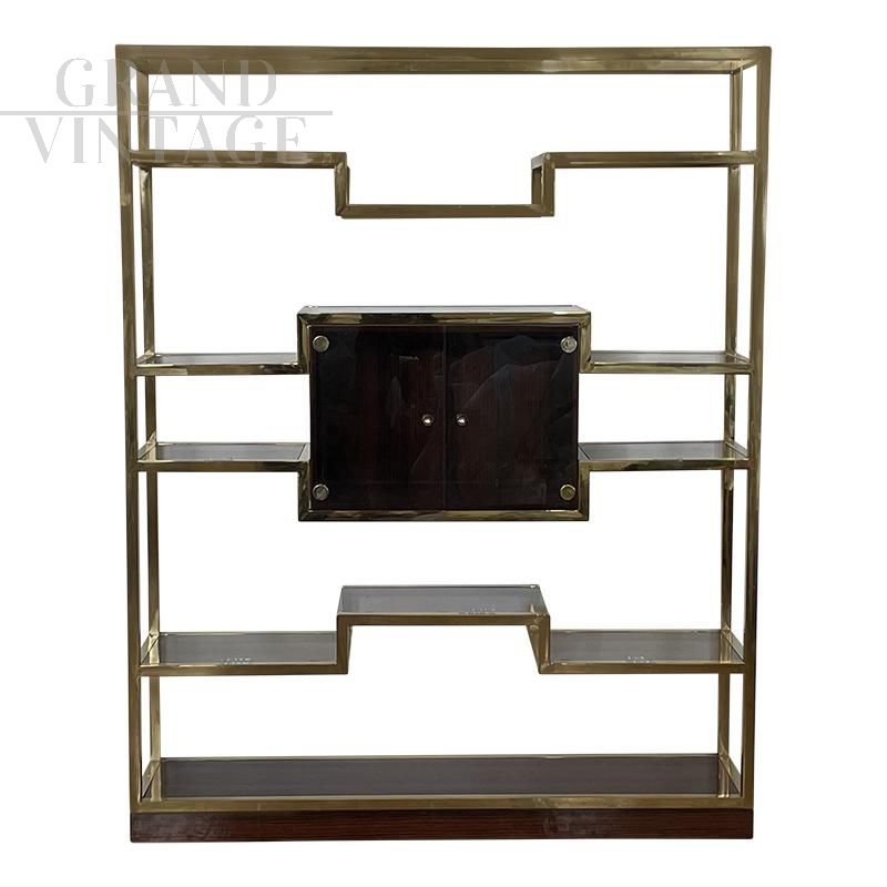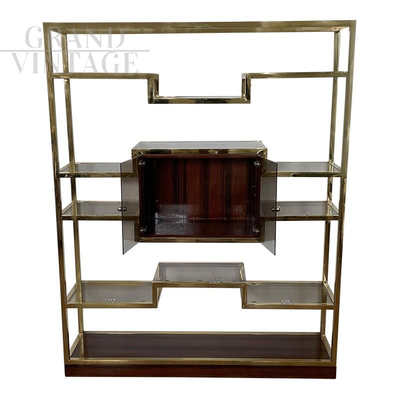 Libreria a giorno design in tubolare di ottone dorato, con basamento in pregiato legno di makassar, ripiani in vetro fumé e modulo centrale a vetrina in palissandro con ante in vetro fumé; pomellini in metallo cromato.