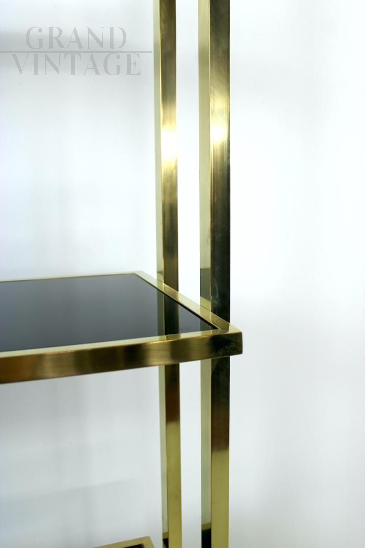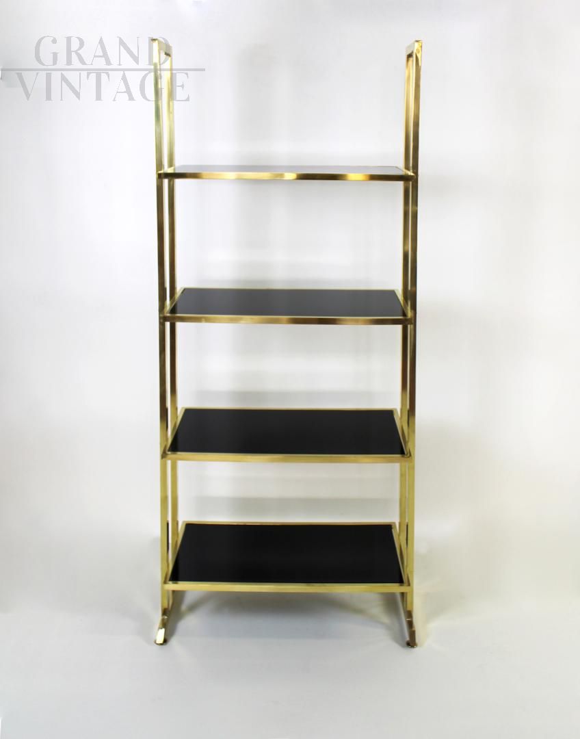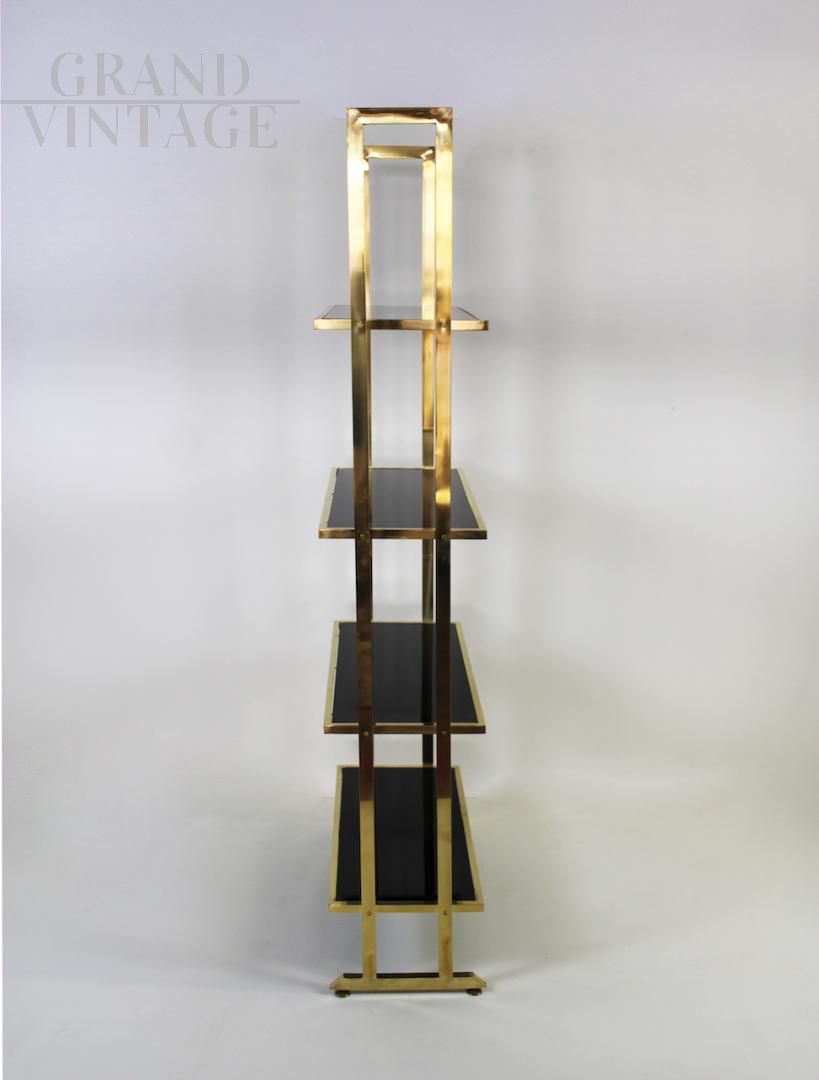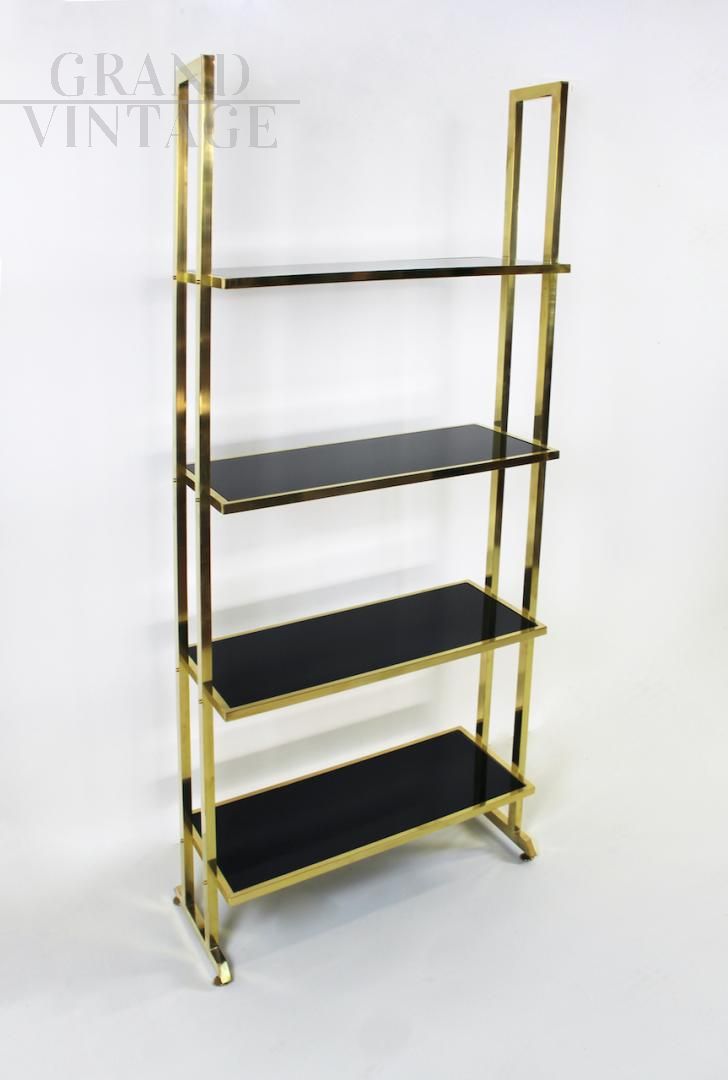 Elegante libreria design modernariato con struttura interamente in ottone e 4 ripiani in vetro nero, Italia anni '70.