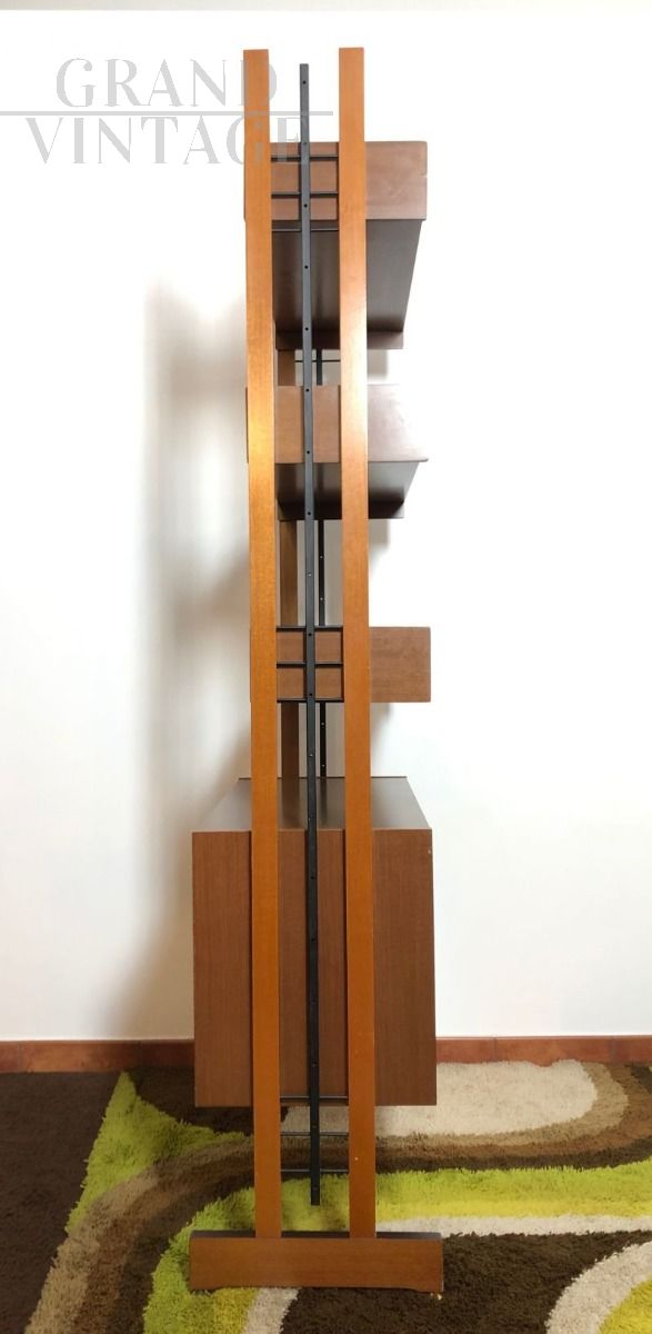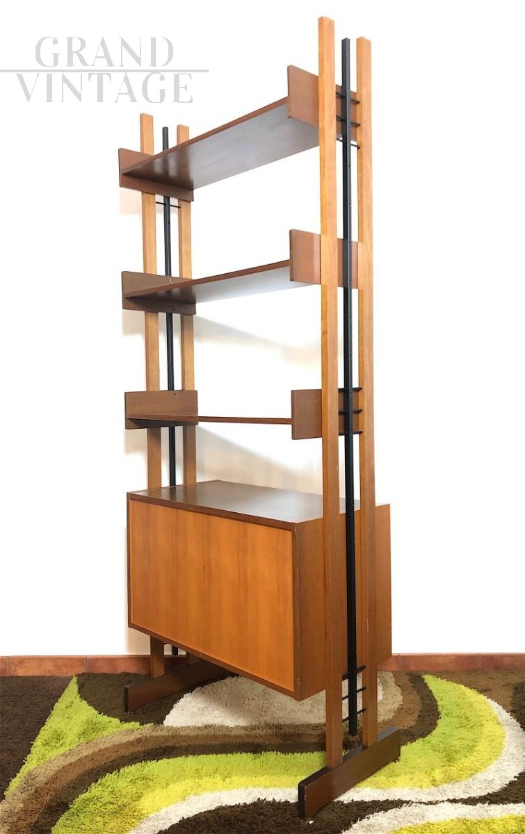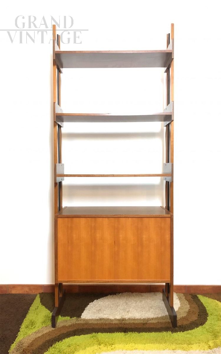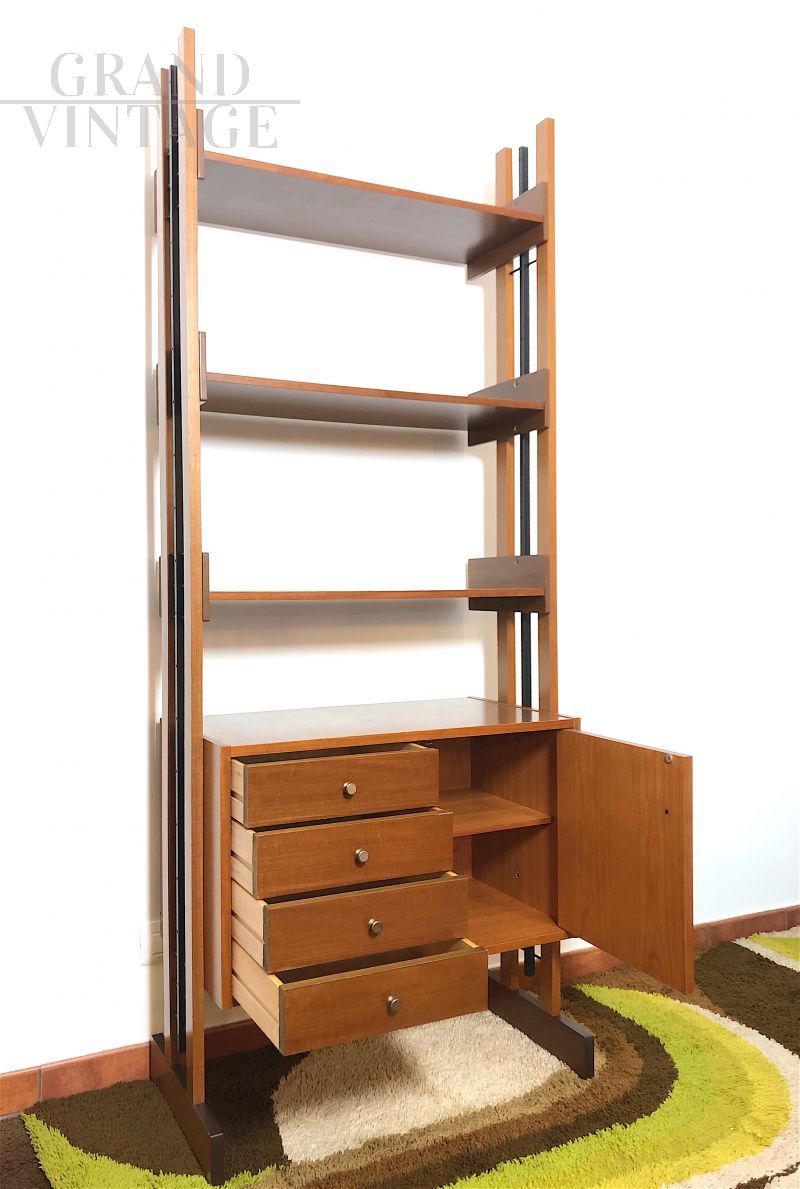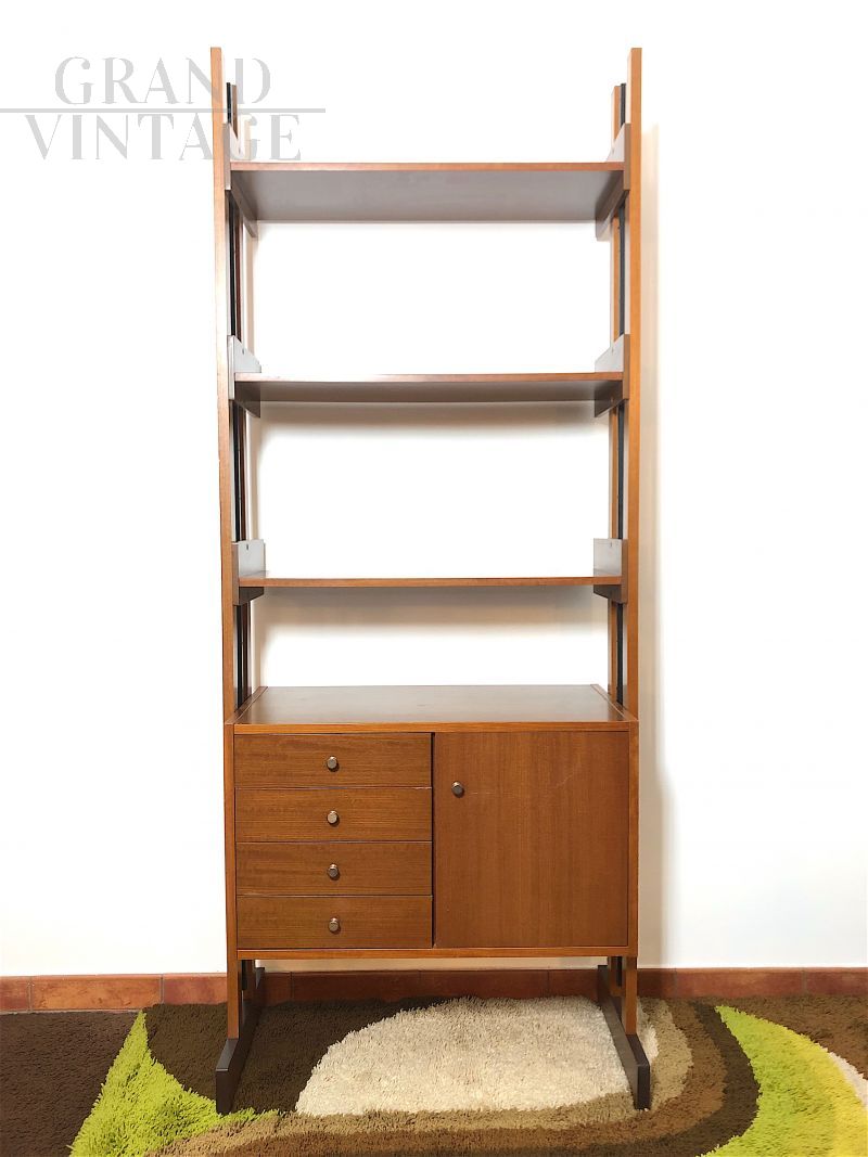 Piccola libreria modulare vintage a una campata degli anni '60 di manifattura Italiana, realizzata in legno con impiallacciatura in teak, montanti in metallo e legno, con piedi regolabili in ottone, ferramenta in ottone. Il mobile rappresenta la sfida e lo spirito del nuovo degli anni '60. La Libreria è composta da 4 mensole e da 1 modulo con 4 cassetti e anta apribile e relativo ripiano interno. Completamente restaurata e sanificata, in perfette condizioni.