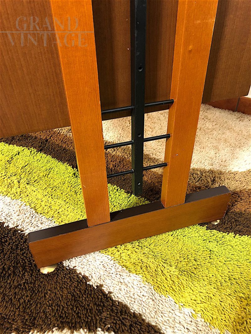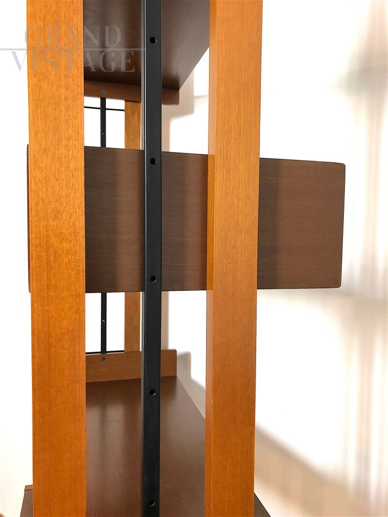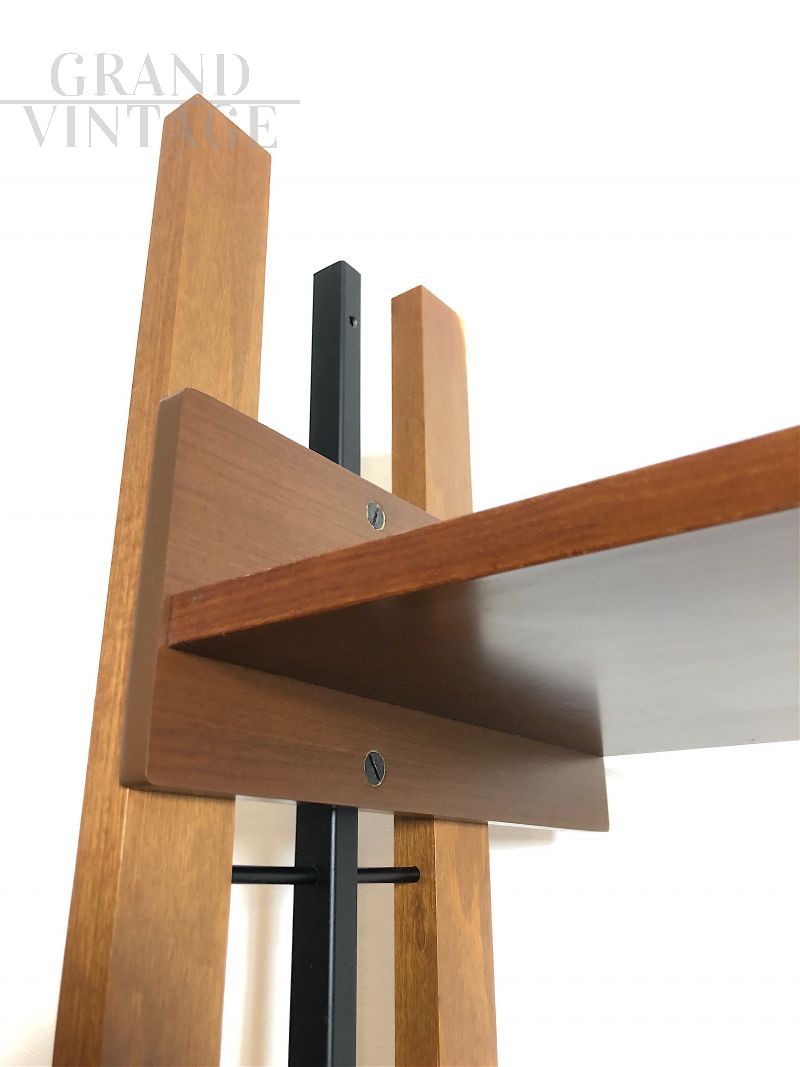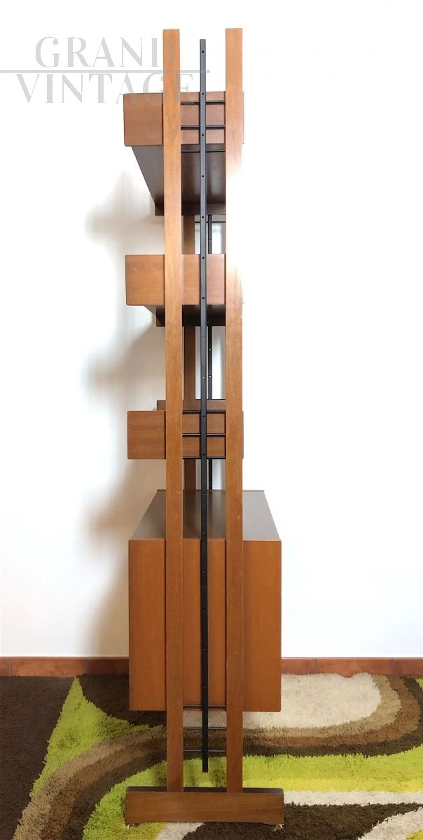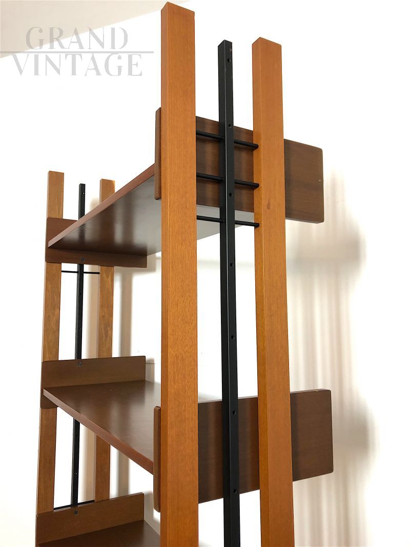 Piccola libreria modulare vintage a una campata degli anni '60 di manifattura Italiana, realizzata in legno con impiallacciatura in teak, montanti in metallo e legno, con piedi regolabili in ottone, ferramenta in ottone. Il mobile rappresenta la sfida e lo spirito del nuovo degli anni '60. La Libreria è composta da 4 mensole e da 1 modulo con 4 cassetti e anta apribile e relativo ripiano interno. Completamente restaurata e sanificata, in perfette condizioni.