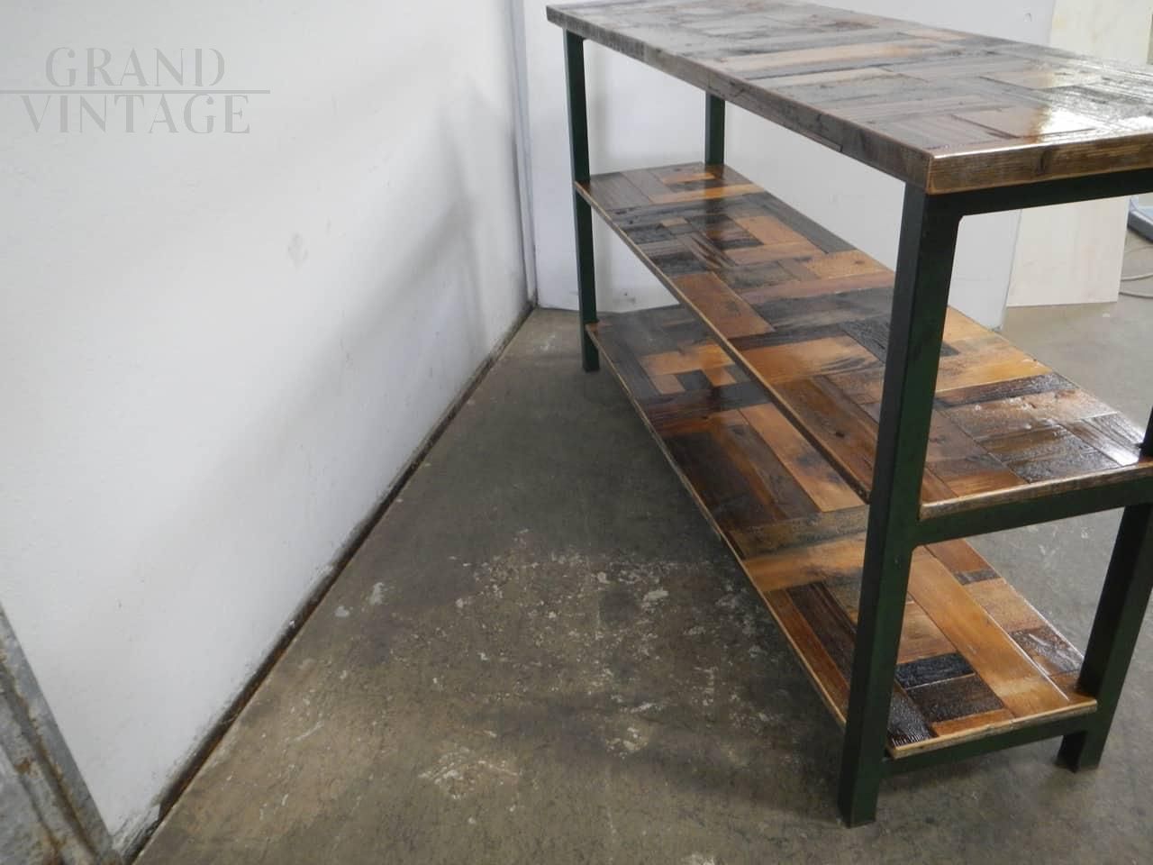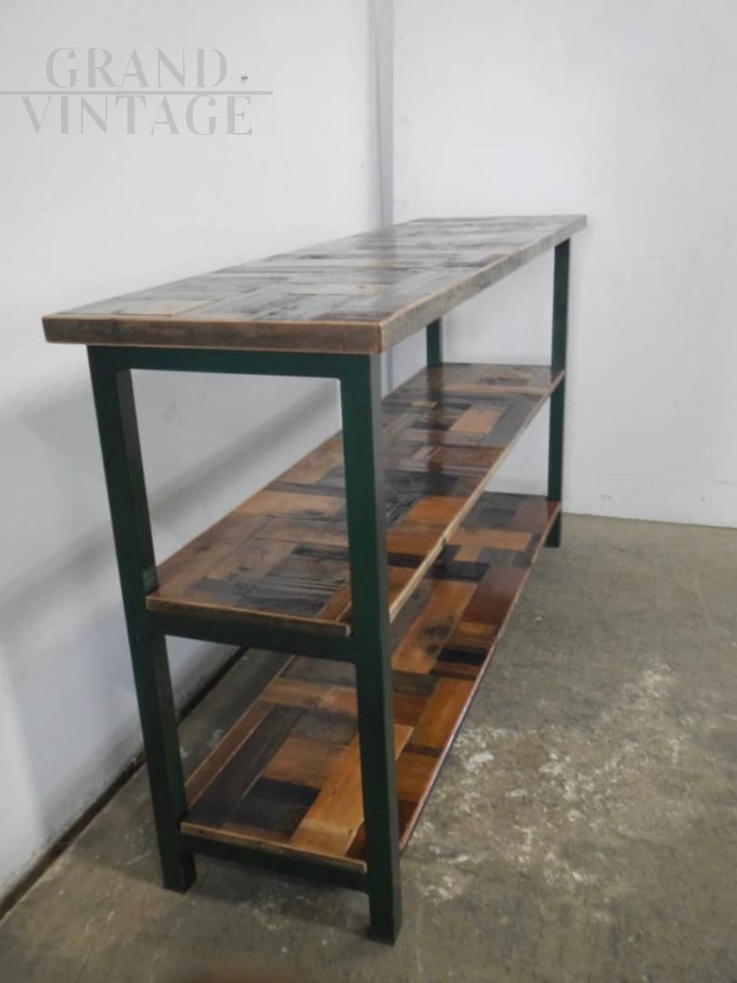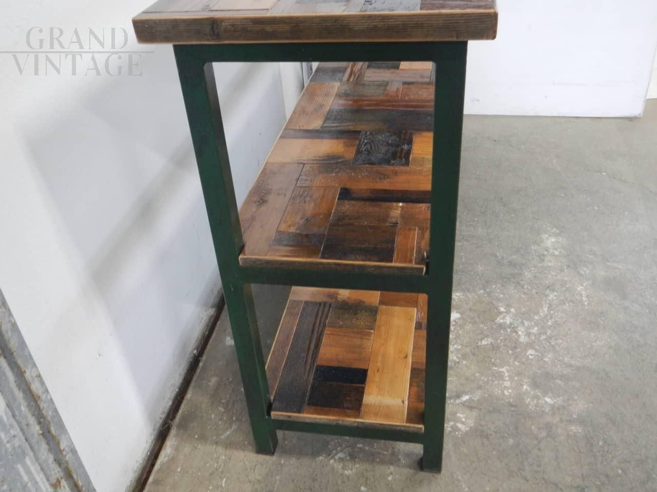 Scaffale libreria industriale in metallo verde con 3 mensole in legno di abete di spessore cm 3 lavorate a patchwork in tonalità di marrone. Rifinito con vernice da legno. La distanza tra mensole è di cm 37 - 38. In buone condizioni, restaurato.