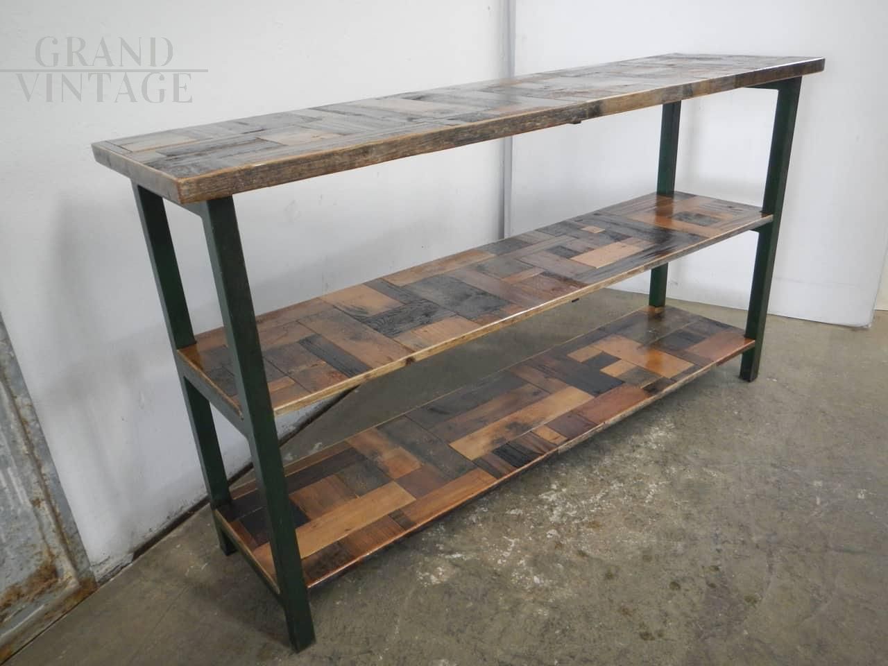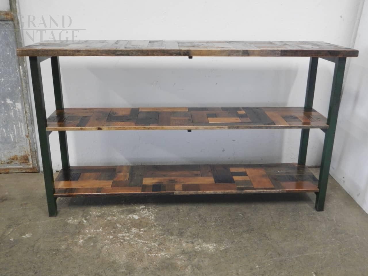 Libreria scaffale industriale in legno patchwork a 3 ripiani, anni '70