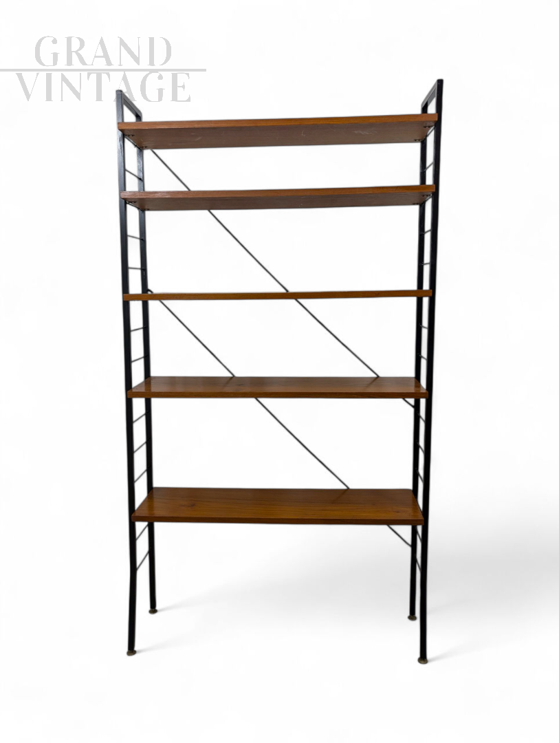 Libreria vintage svedese a giorno con 5 ripiani in legno teak e con struttura a montanti in ferro laccato nero, anni '60. Ottime condizioni, leggeri segni del tempo.