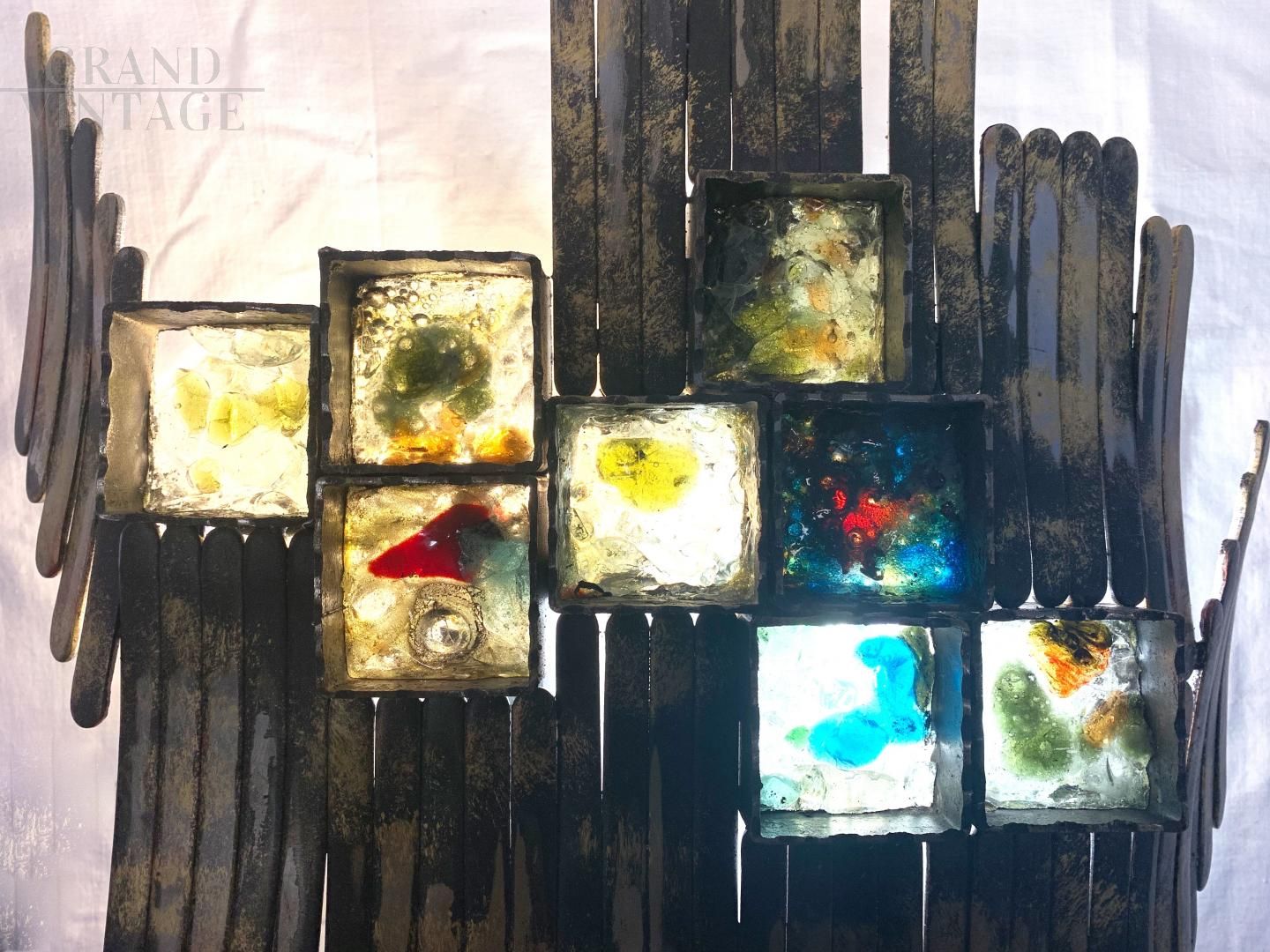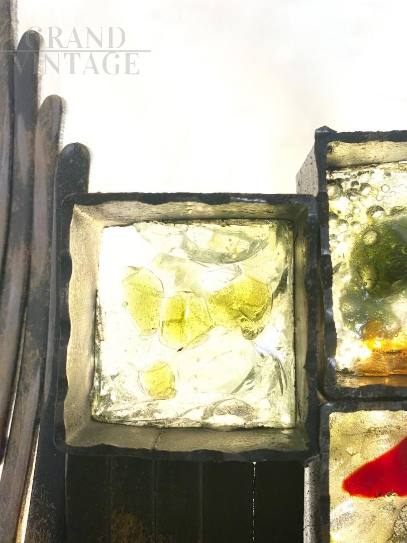Applique singola di ferro battuto artigianale con vetri di Murano, ditta Longobard, con vetri tagliati a mano e incollati alla struttura, molto belli e particolari. La struttura è in ferro battuto lavorato a mano. La lampada ha 2 lampadine con attacco E27. Ottima lampada per ambienti rustici. Ha un quadrato con un vetro che ha una piccola mancanza, che non si nota molto.