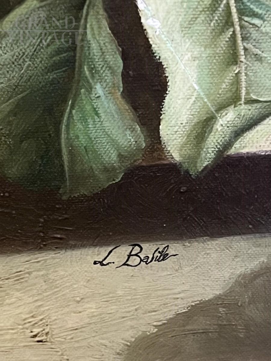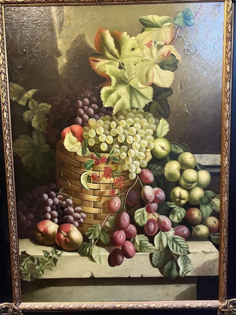 Pregevole dipinto dell'artista Luigi Basile realizzato ad olio su tela nei primi anni del '900 e raffigurante una natura morta di frutti autunnali, in particolare grappoli d'uva. La natura qui è messa in risalto su questo colonnato marmoreo, una canestra stracolma di frutta dai colori accesi e variegati. Opera firmata in basso a destra dall'artista, racchiusa entro una monumentale cornice originale. Dipinto munito di certificato d'originalità e garanzia.